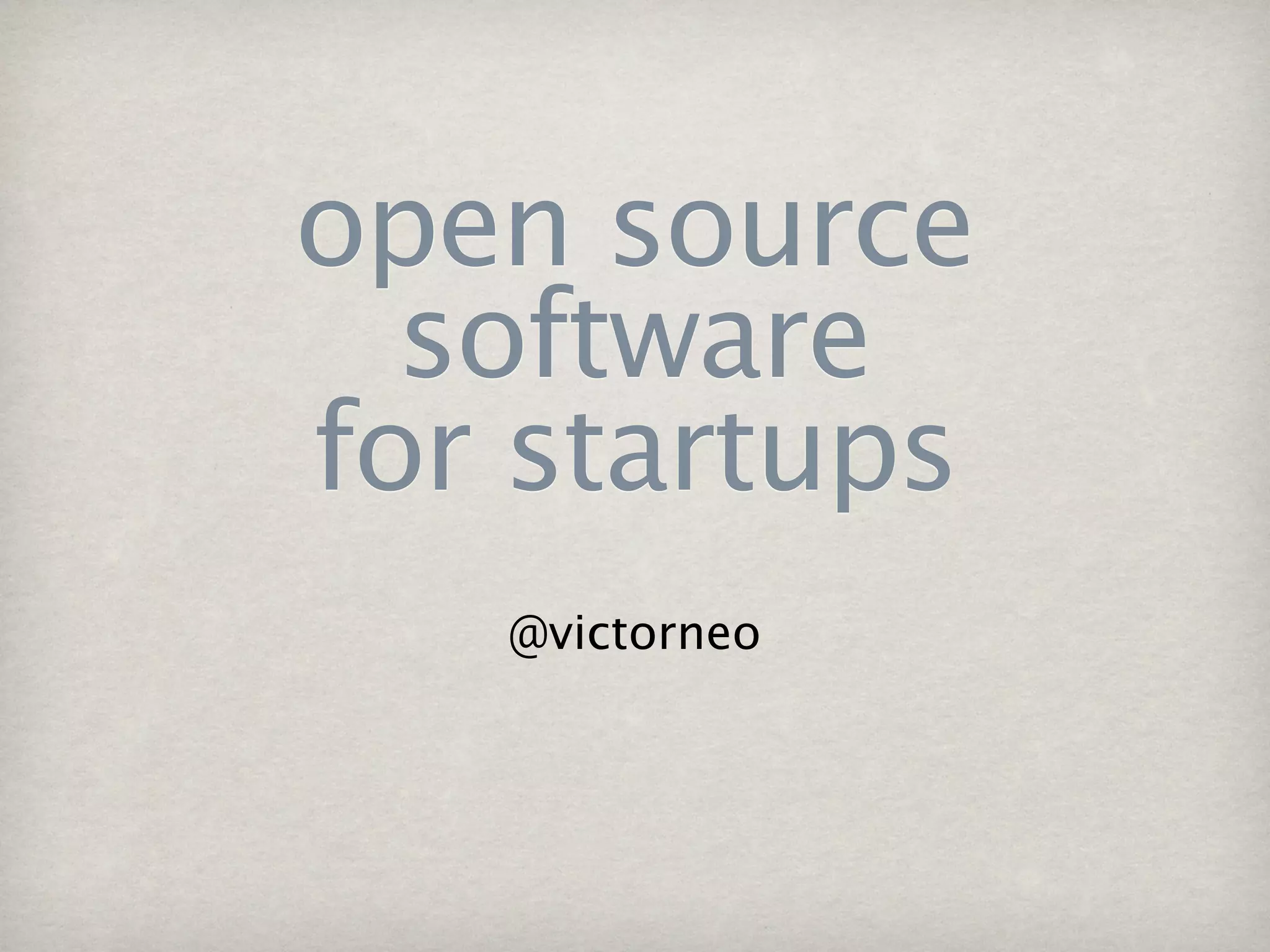 This document discusses open source software options for startups from the perspective of Victor Neo, a computer science student and CTO. It provides an introduction to Victor and his experience with startups and open source software. The document then discusses the cost savings and importance of people when using software. It provides an overview of common open source office, accounting, graphics, and development applications that startups can use. Examples are given of how Facebook, Twitter, and Victor's own company Pikaland have utilized open source software. The document encourages contributing back to open source communities and lists upcoming talks on related topics.