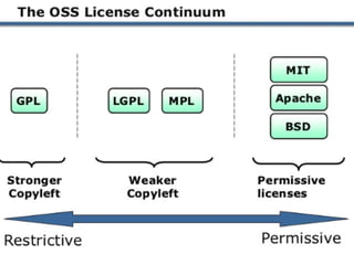 The document provides an overview of open source software (OSS) and its licensing, highlighting the essential differences between OSS and commercial software. It categorizes licenses into copyleft and non-copyleft, outlining their terms and conditions, and discusses relevant legal cases regarding compliance issues. Additionally, it emphasizes the importance of understanding license terms for proper software usage and modification to avoid breach of contractual obligations.