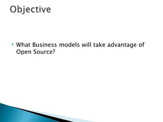 This document discusses business models for open source software. It suggests that most open source software generates use value rather than sale value as an intermediate good. It proposes service models where vendors support open source software and exchange continuous value with customers. The document also provides examples of how companies have used open source software to drive hardware sales, sell services, and sell additional content and applications.