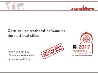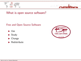 This document discusses Statistics Netherlands' use of open source software. It notes that open source software is driving modern statistics and data science. It describes how Statistics Netherlands uses communities like GitHub and Stack Overflow. It discusses motivations for using open source software, including economic benefits and supporting the community. It highlights Statistics Netherlands' curated list of over 50 open source software packages covering different areas. It provides examples of R packages and Node.js packages contributed by Statistics Netherlands. Finally, it offers tips for contributing to open source software projects.