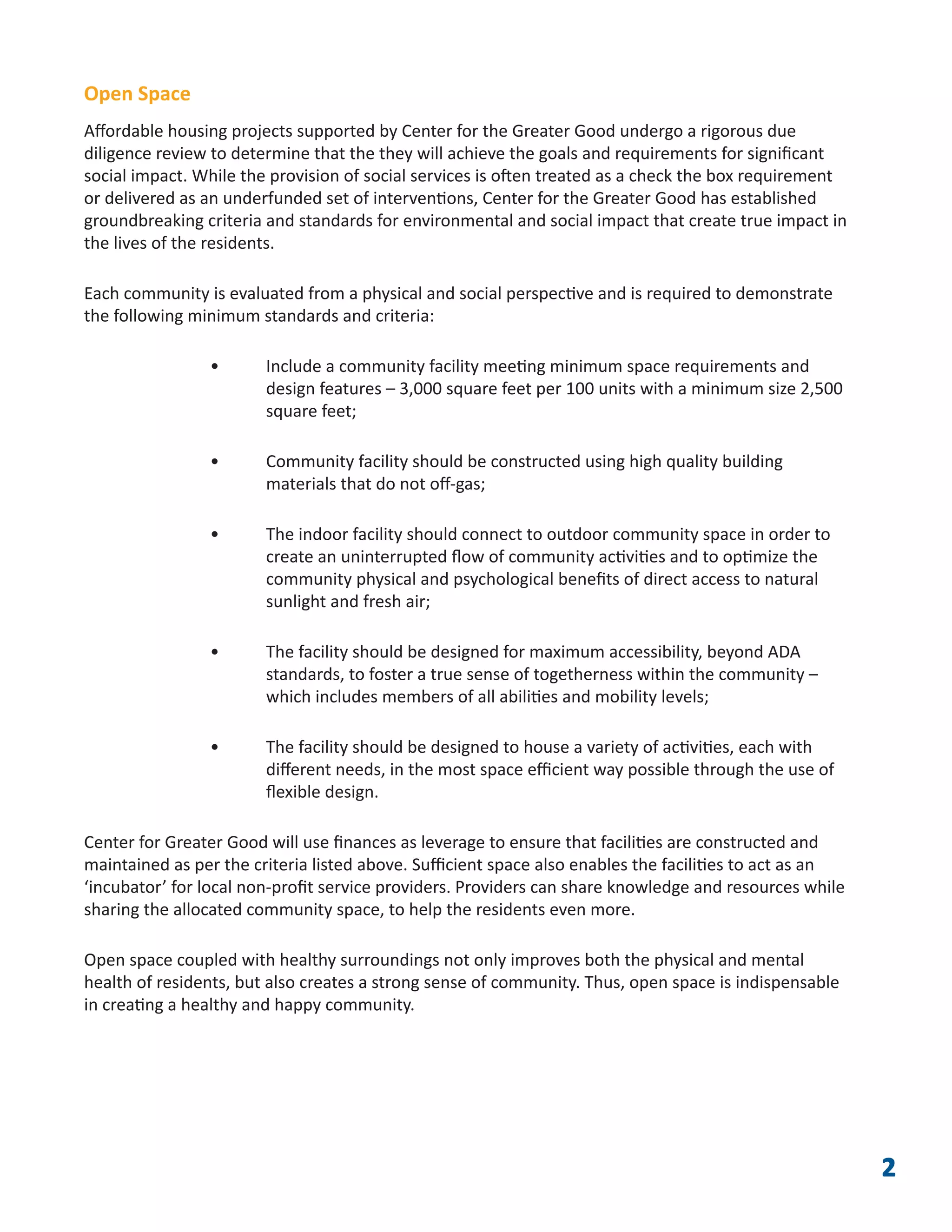 Center for Greater Good conducts rigorous reviews of affordable housing projects to ensure they achieve significant social impact. This includes establishing groundbreaking criteria for environmental and social standards. Each community is evaluated physically and socially, and is required to demonstrate minimum standards like community facilities of at least 3,000 square feet per 100 units, constructed using non-toxic materials. The facilities must connect indoor and outdoor community spaces, be fully accessible, and designed for flexible use of various activities. Sufficient open space and healthy surroundings in communities not only improves residents' health but also fosters a strong sense of community.