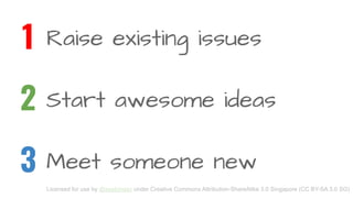 The document describes the principles of Open Space Technology, emphasizing the importance of participants being the right people, starting at the right time, and accepting outcomes. It introduces the 'Law of Two Feet,' encouraging attendees to leave if they feel they are neither contributing nor learning. Additionally, it is licensed under Creative Commons Attribution-ShareAlike 3.0 Singapore.