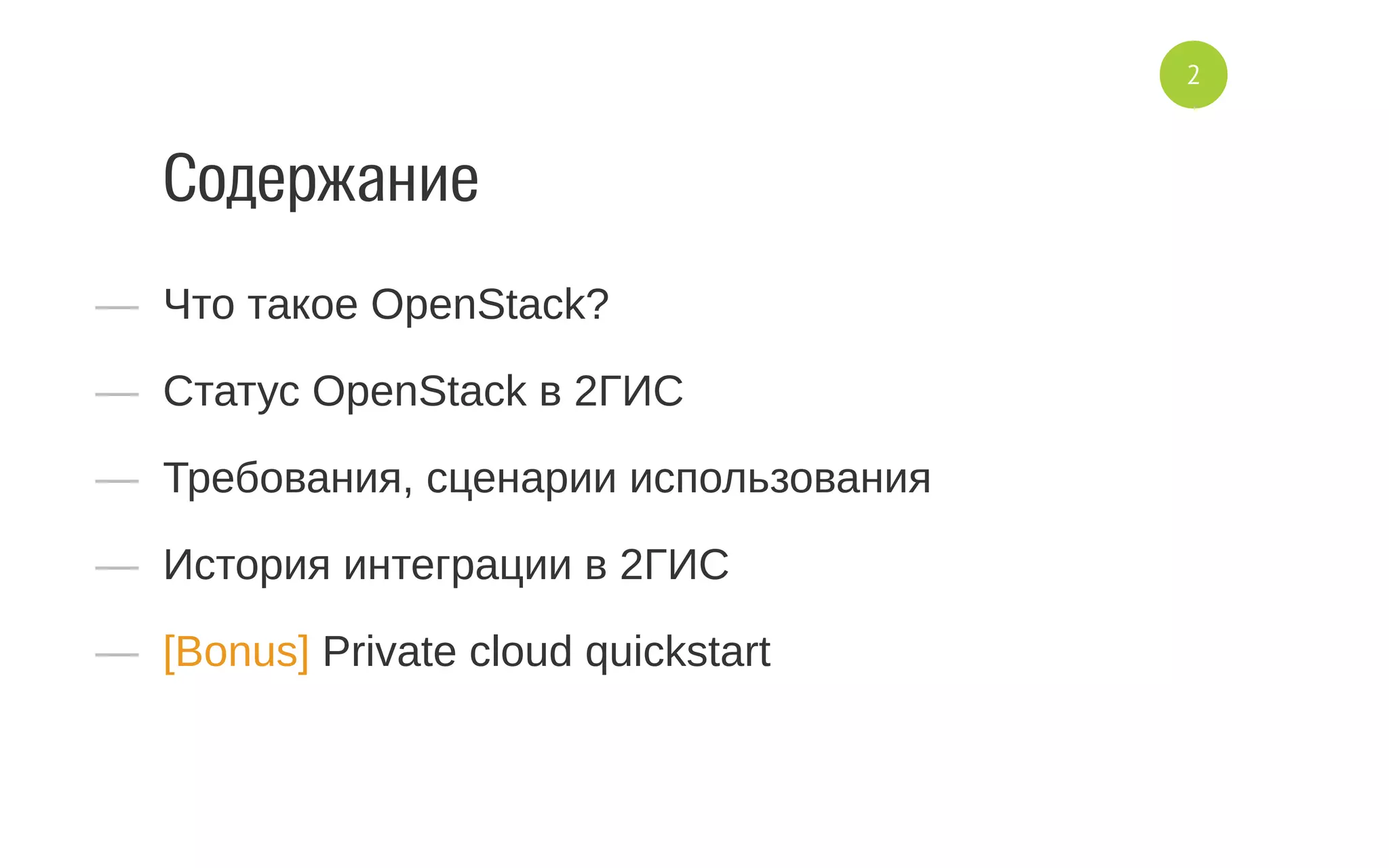 Документ обсуждает OpenStack, его статус в компании 2ГИС и преимущества его использования для управления ресурсами датацентра. Он перечисляет сценарии применения, требования к инфраструктуре и проблемы, с которыми сталкиваются команды в процессе интеграции. Также представлен план перехода на OpenStack и краткое руководство для быстрого старта с частным облаком.