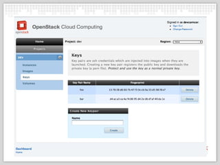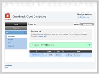 The OpenStack Dashboard project provides a Python/Django-based web interface for managing OpenStack projects, users, images, instances, volumes, and more. Originally created by NASA for the Nebula project, it is now an OpenStack incubation project. Developers are working to transition it from the original Amazon EC2 API to the new OpenStack API to take advantage of new features. The project is looking to rename its core module, introduce submodules for different OpenStack services, and integrate PaaS technologies to provide a more full-featured dashboard.