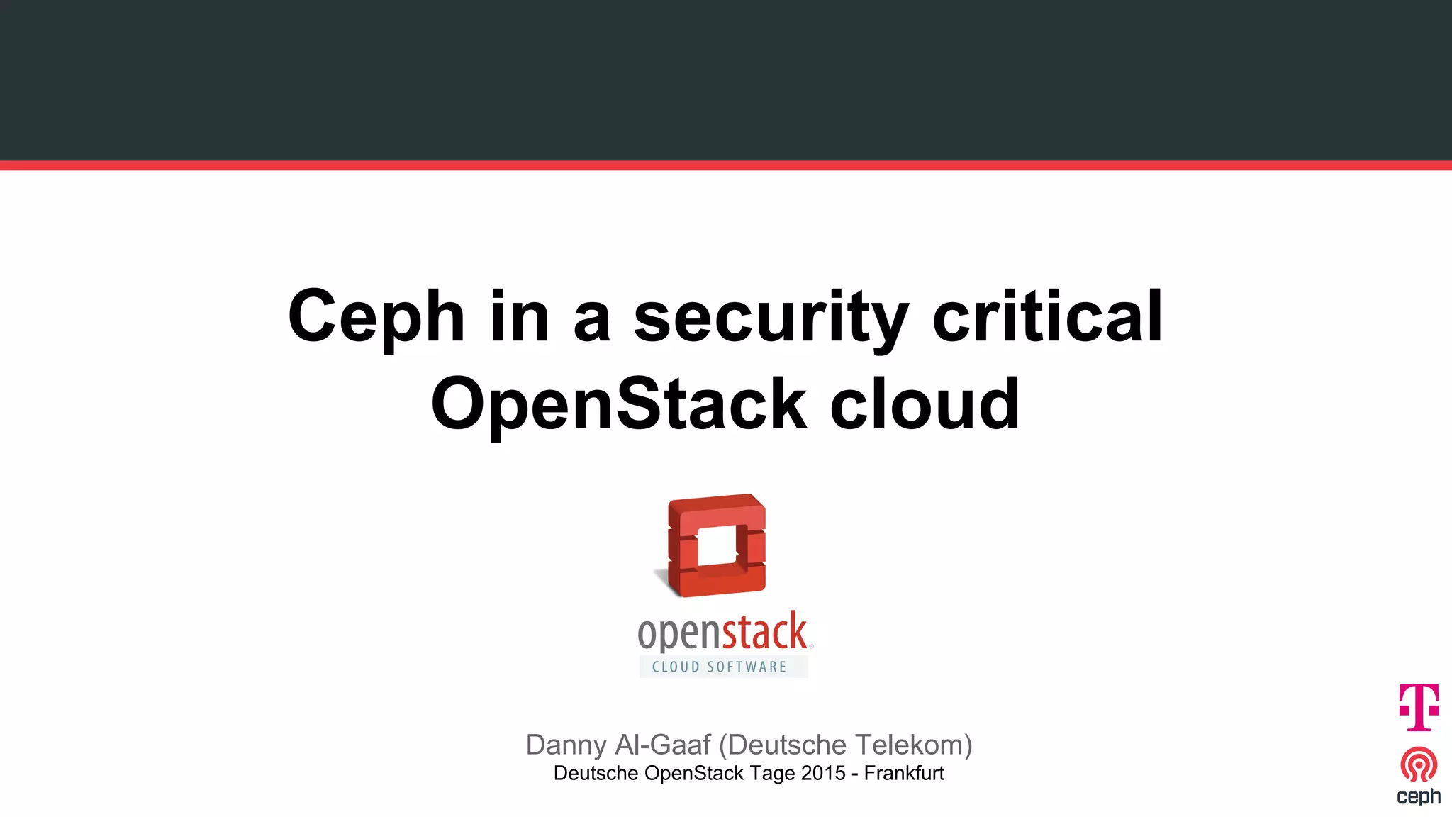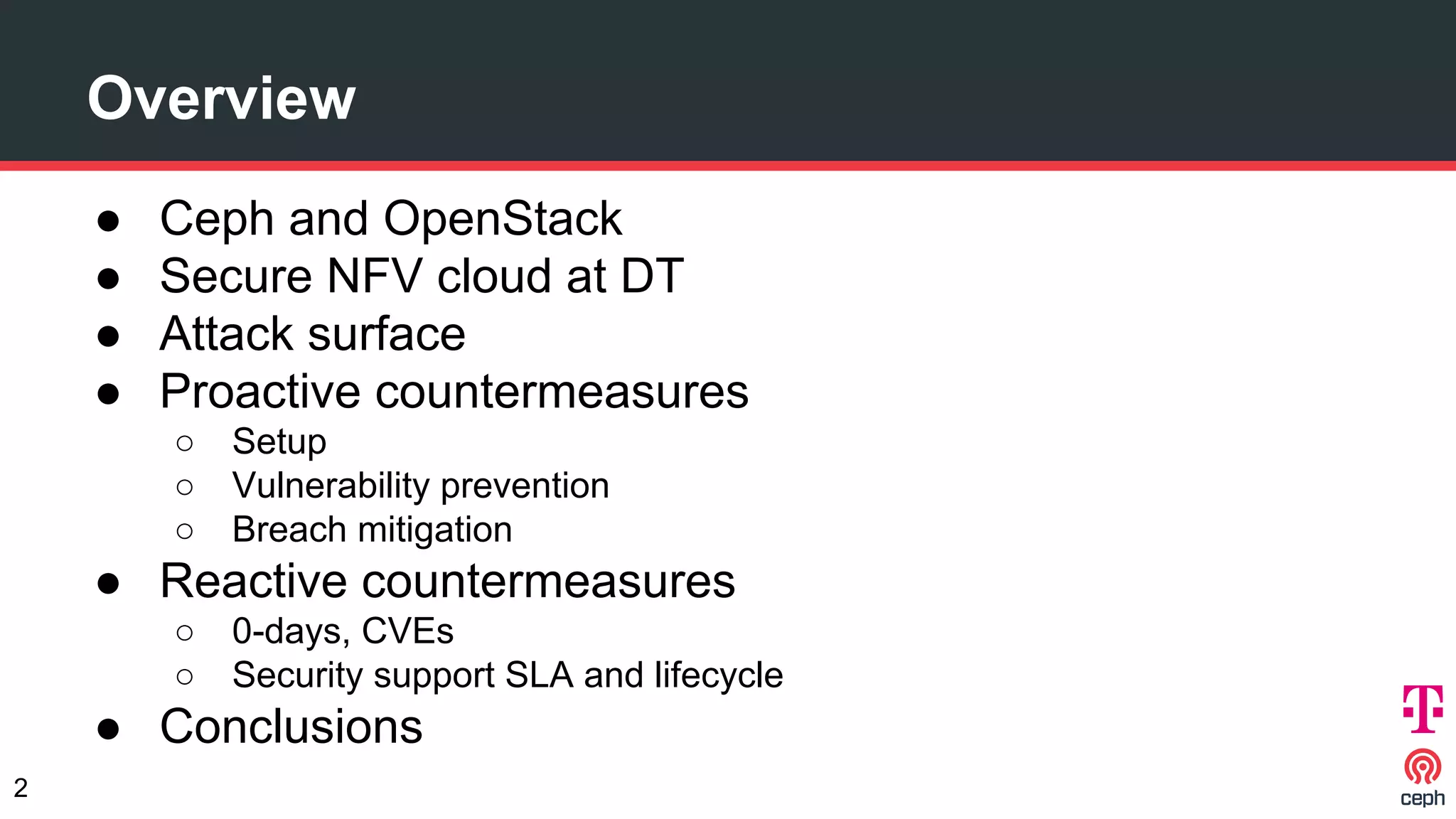 The document discusses implementing Ceph within a secure OpenStack cloud environment, particularly focusing on Deutsche Telekom's NFV cloud design and security measures. It outlines proactive and reactive countermeasures against various attack surfaces and emphasizes the importance of separation of security zones and robust key management. The document also highlights ongoing efforts to enhance security practices, including encryption and vulnerability assessment processes.