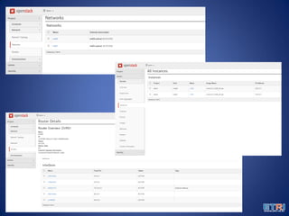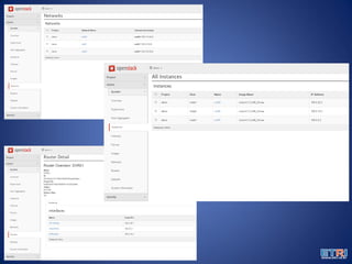 OpenStack DVR (Distributed Virtual Router) allows L3 routing functions to be distributed across compute nodes by creating router namespaces on each compute node. This avoids bottlenecks and single points of failure at network nodes. DVR supports east-west inter-subnet routing, SNAT for external access without floating IPs, and floating IPs associated with internal VMs for direct external access. Traffic flows are encapsulated in VXLAN/GRE tunnels between compute nodes and routed appropriately within each node's router namespace.