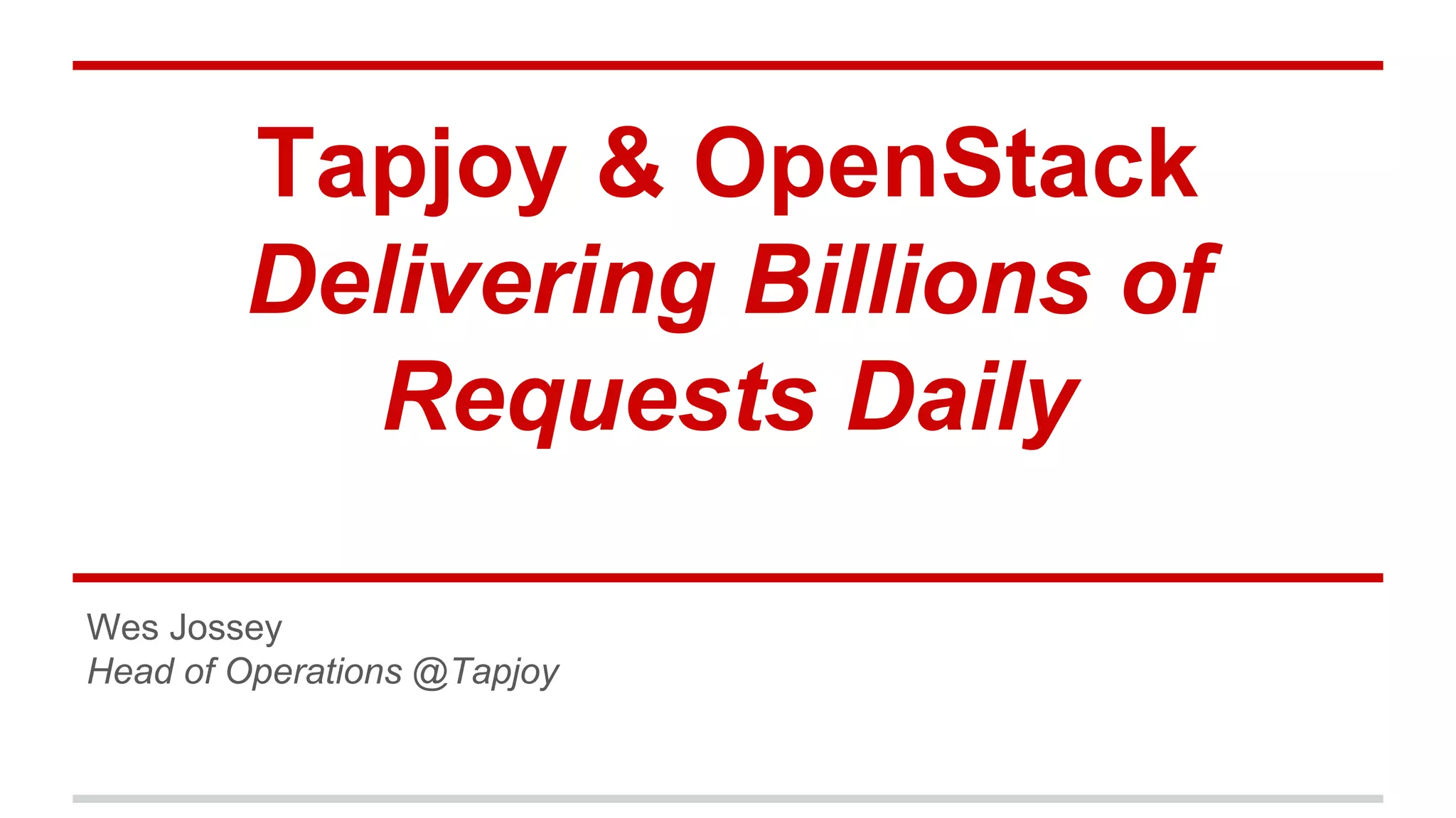 The document discusses Tapjoy's use of OpenStack and AWS. Tapjoy is a global app-tech startup that powers monetization, analytics, user acquisition and retention for mobile developers. They were an early AWS adopter but grew to over 1100 AWS VMs daily, so decided to build their own OpenStack deployment (Tapjoy-1) for additional compute capacity and flexibility. Key points included partnerships with Metacloud and Equinix to deploy and manage Tapjoy-1, challenges around hardware delays and negotiations, and plans to use both AWS and Tapjoy-1 flexibly based on application needs.