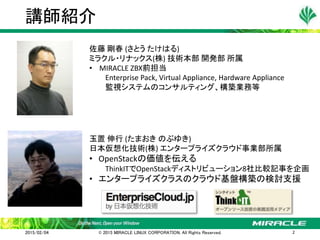 講師:ミラクル・リナックス 佐藤様、日本仮想化技術 玉置 日時:2015/3/4 タイトル:使ってわかった!現場担当者が語るOpenStack運用管理の課題 概要: - OpenStack環境の運用上の課題とその解決 -- Zabbixによる監視システム -- Hatoholによる統合監視システム - これからのインフラ監視