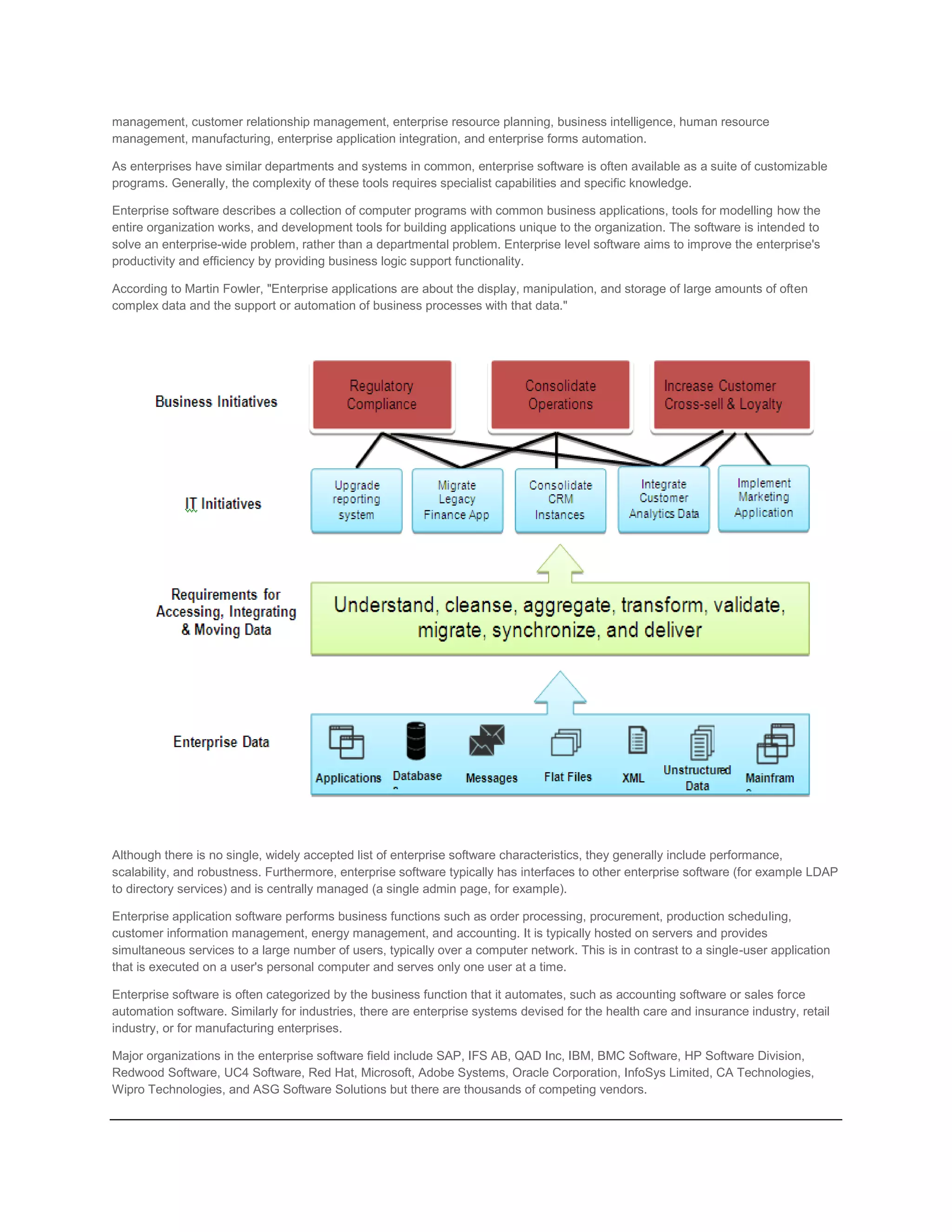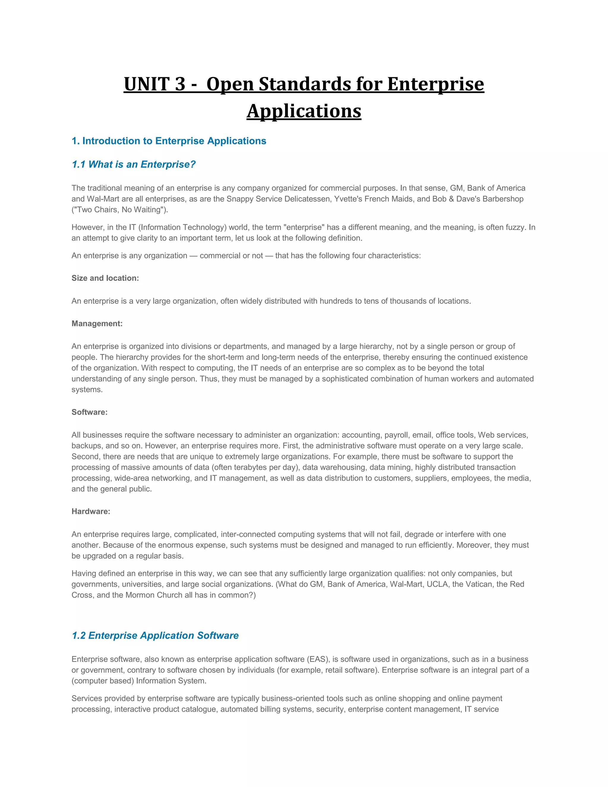 The document discusses enterprise applications and enterprise application integration (EAI). It defines an enterprise and enterprise application software. Open standards are important for EAI to allow different applications to share data easily. Web services and formats standards like XML help with application integration. Approaches to integration include information-oriented, orchestration-oriented, and services-oriented integration. Web services allow applications from different sources to communicate without custom coding and help with enterprise application integration.