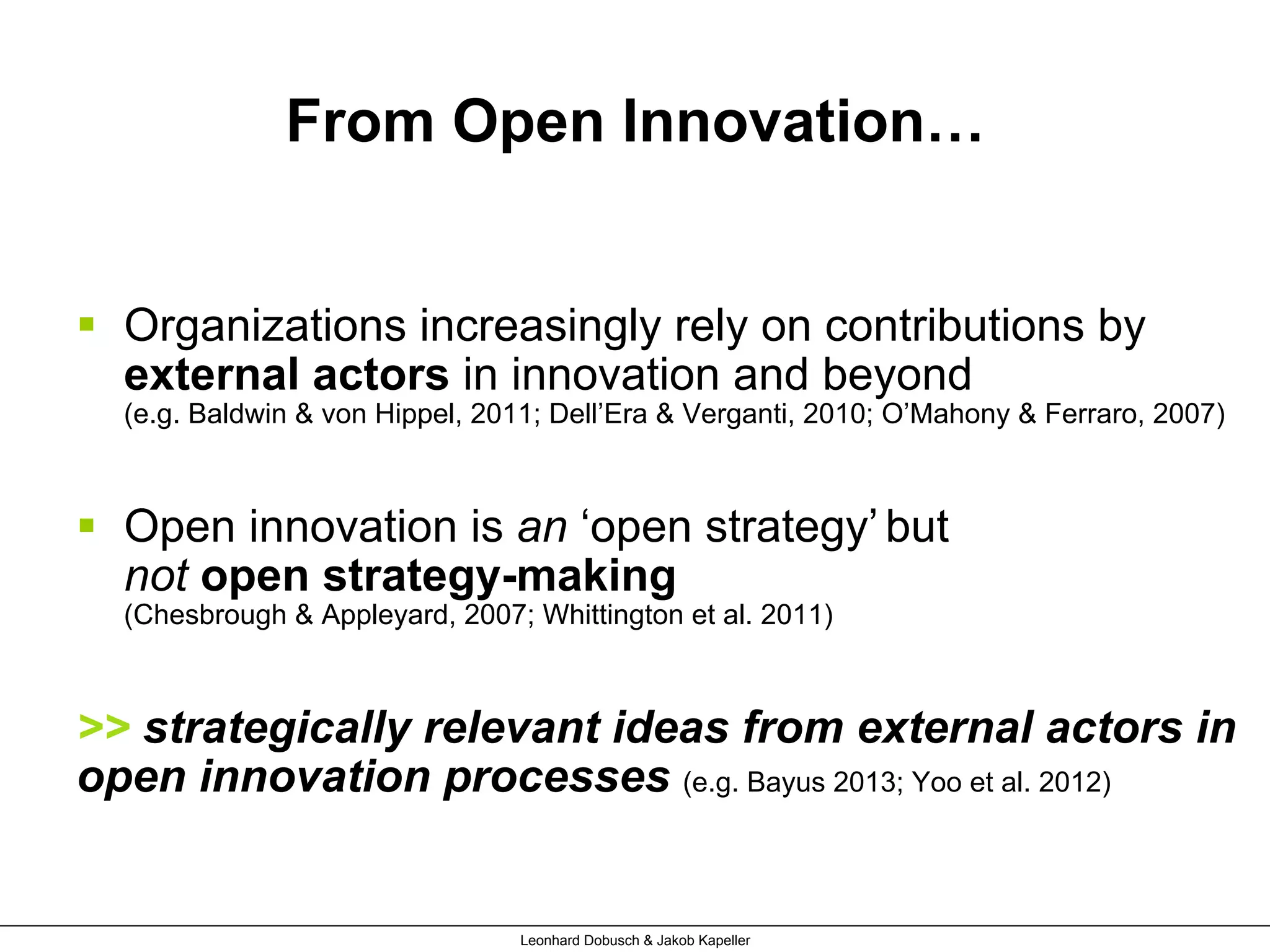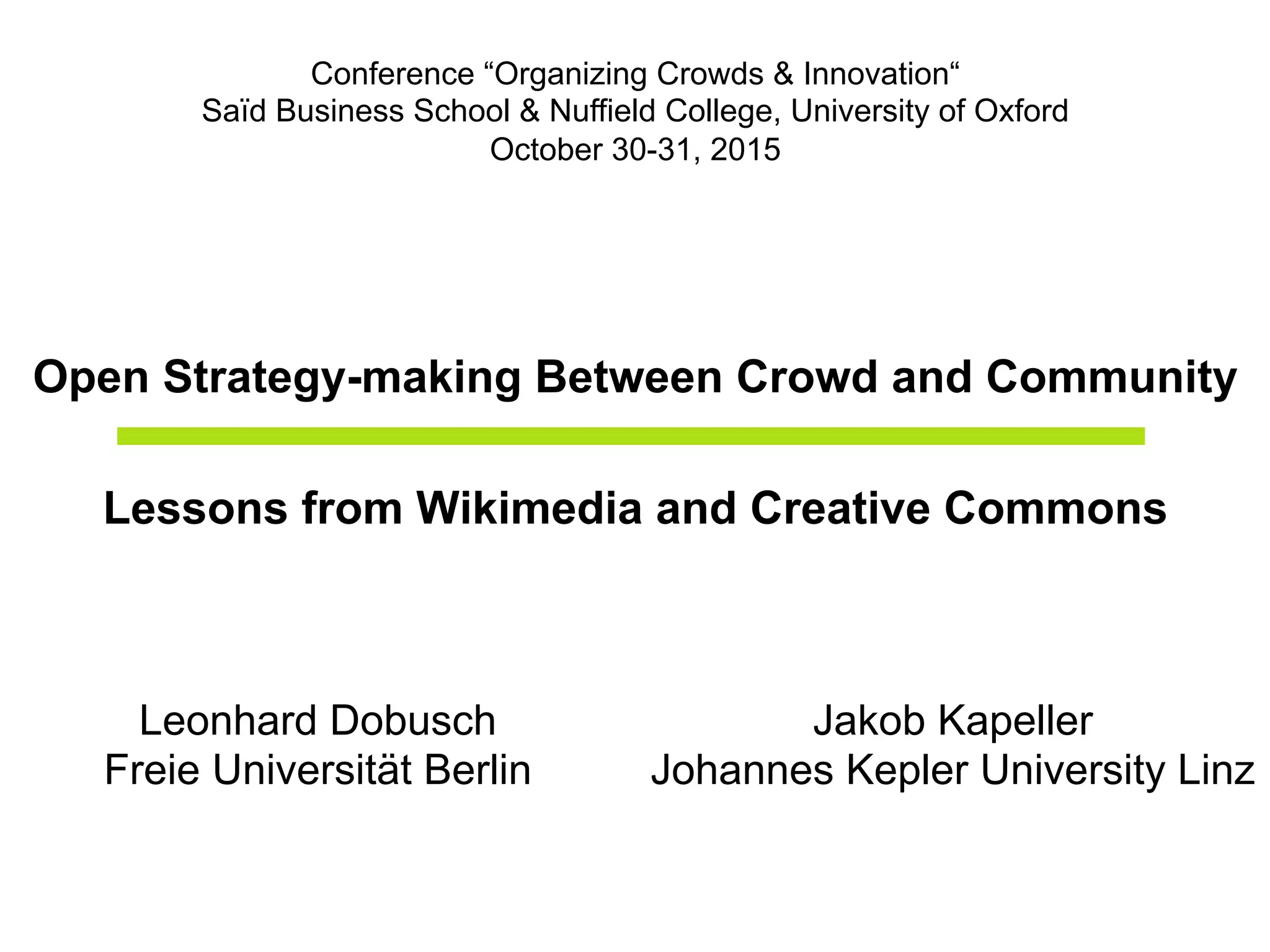 The document discusses the concept of open strategy-making by organizations that engage external crowds and communities in their strategic processes, drawing lessons from the Wikimedia and Creative Commons initiatives. It highlights the necessity of incorporating external contributions and the variations in levels of openness in strategy-making practices, such as democratic and exclusive approaches. The research is based on extensive interviews and data from various organizations, showcasing how participatory techniques can impact strategy development.