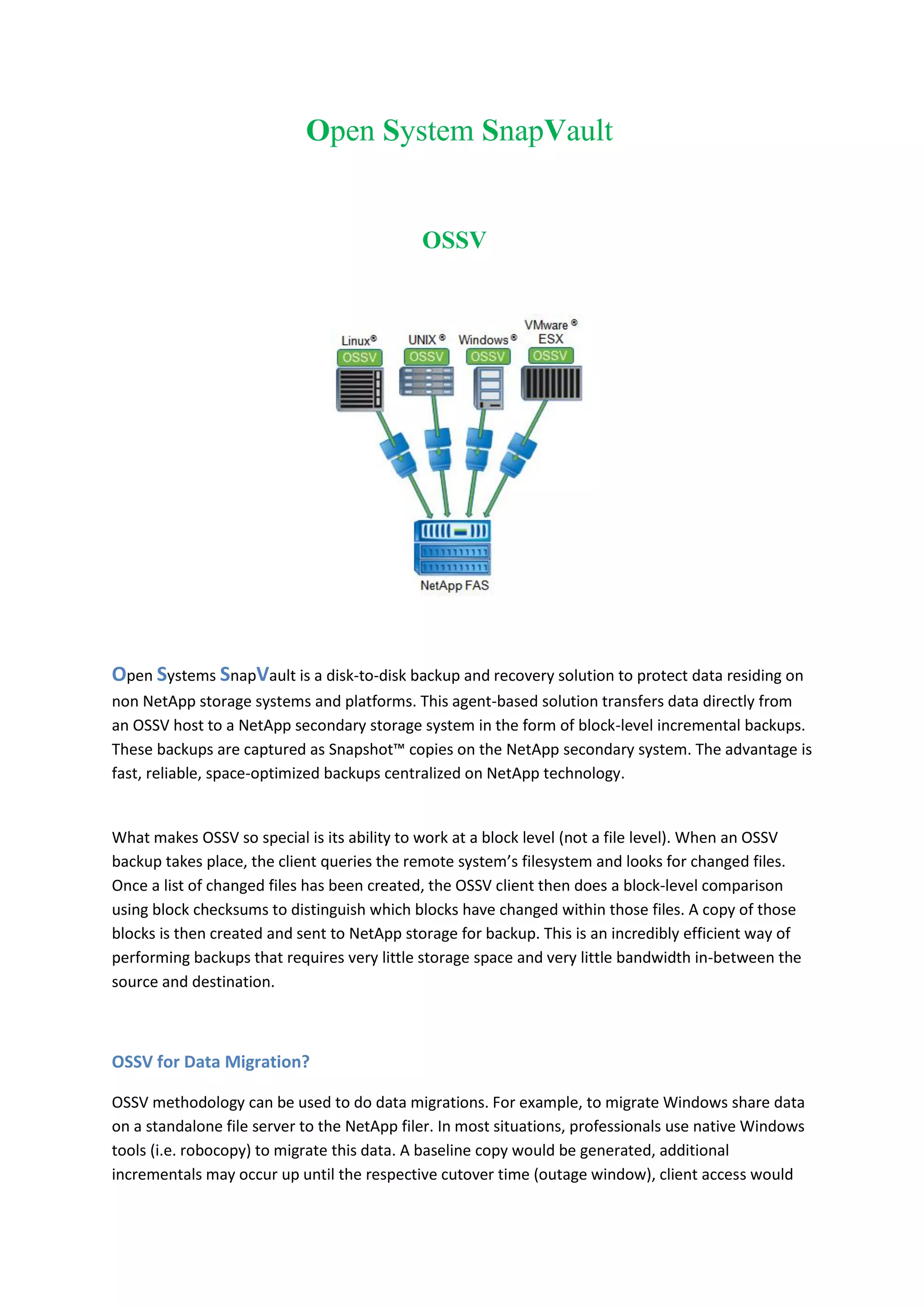 Open System SnapVault (OSSV) is a disk-to-disk backup solution that uses block-level incremental backups to efficiently backup data from non-NetApp systems to NetApp storage. OSSV can also be used for data migrations by performing block-level incremental transfers, which significantly reduces transfer times compared to file-level tools when migrating large frequently changed files. During a restore, the DFM server uses the NDMP protocol to communicate with both the OSSV host and NetApp filer to initiate and manage the restore process.