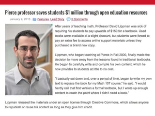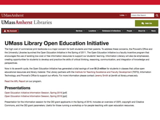 This document discusses the high cost of textbooks and the open educational resources (OER) initiative in Rhode Island. It notes that textbook costs have risen much faster than tuition and inflation, putting textbooks out of reach for many students. OER provide free and openly licensed alternatives to traditional textbooks. They allow users to retain, reuse, revise, remix and redistribute content. The document outlines several OER repositories and examples of OER impact, such as improved student outcomes and completion rates. It encourages adopting, adapting and creating OER to reduce costs and improve access to education.
