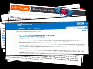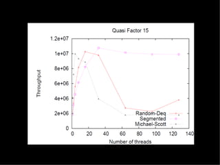 The document discusses practical solutions for multicore programming. It describes some challenges with concurrent programming such as lost updates, deadlocks, and lack of performance. It then presents several solutions to address these challenges, including software transactional memory (STM), lock-free data structures, and relaxed consistency models. STM approaches discussed include DSTM2, JVSTM, Atom-Java, and Deuce STM. It also discusses the need for fine-grained concurrent data structures like a lock-free pool. The document concludes by discussing how relaxing linearizability requirements through approaches like quasi-linearizability can improve concurrency.