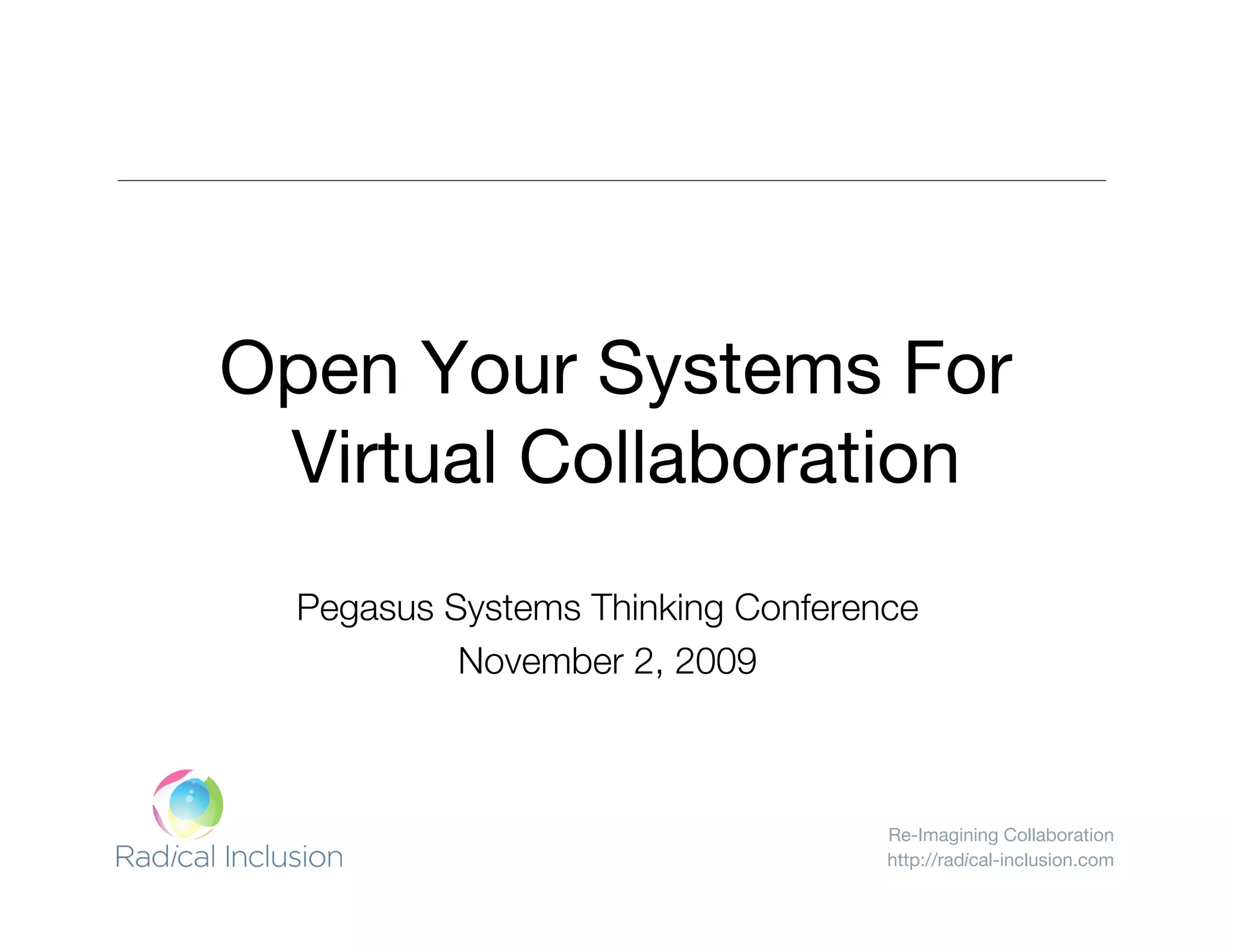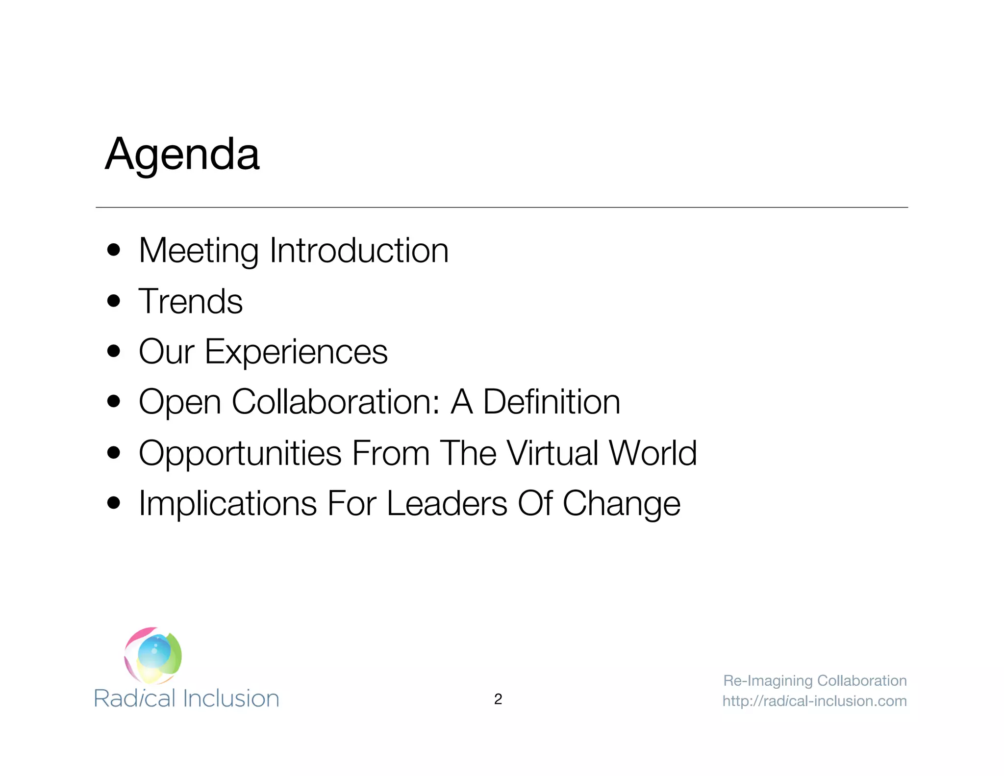 This document outlines a presentation on reimagining collaboration through virtual means. It discusses how today's issues require collaboration on a larger scale. It also explores how the internet and technology have enabled more open and widespread collaboration. The presentation advocates for establishing common frameworks, building trust through processes, and taking advantage of the unique aspects of virtual collaboration in order to achieve levels of collaboration previously not possible.