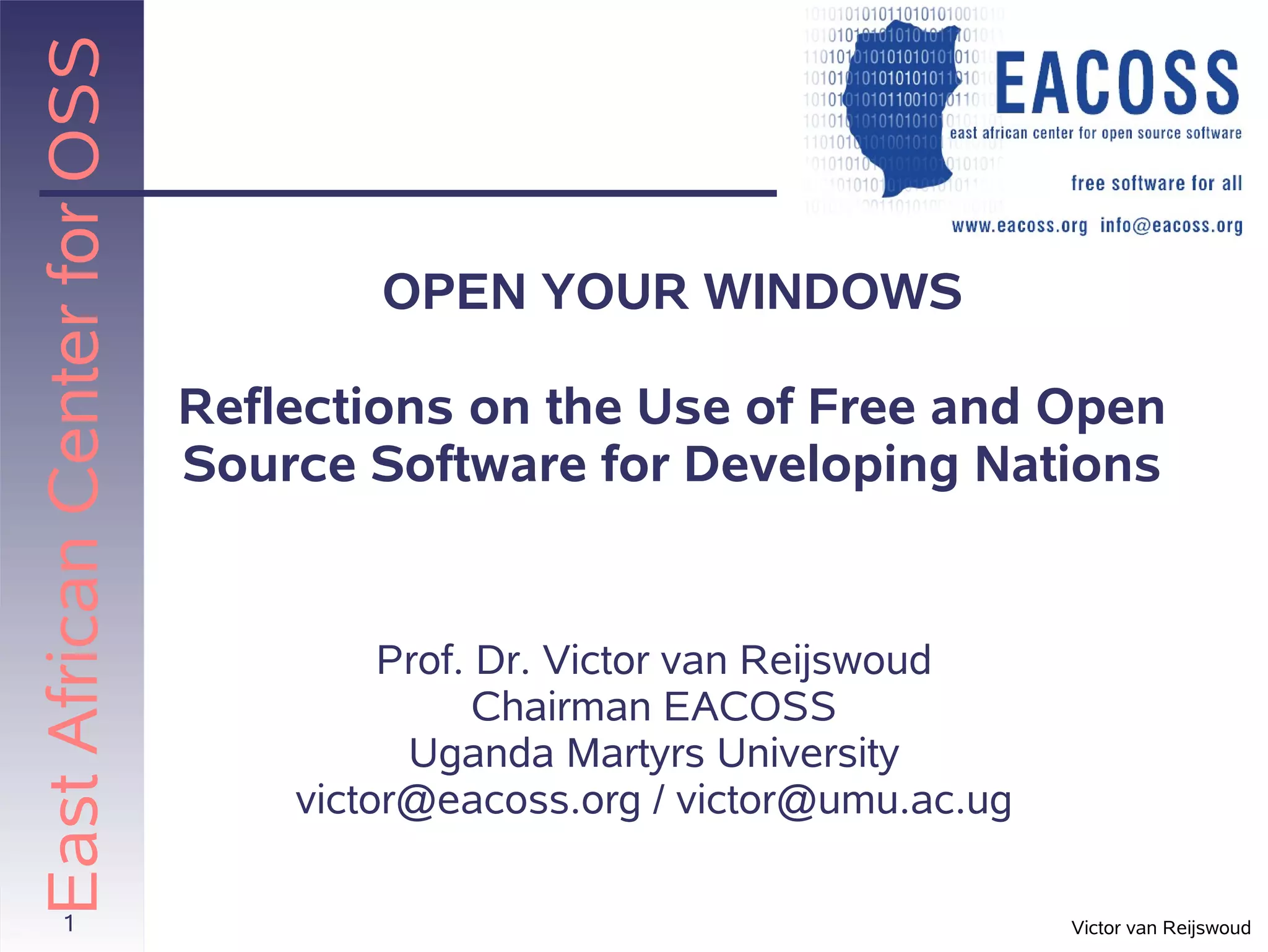 The document discusses the role of open source software (OSS) in developing nations, particularly in Uganda, emphasizing its potential to reduce costs and foster independence. It highlights both the advantages, such as universal access and customization, and the challenges, including limited support and lack of awareness. Case studies from institutions like Uganda Martyrs University and St. Mary's Secondary School illustrate successful OSS adoption and the need for further education and infrastructure improvements.