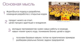 Документ обсуждает возможности использования языка программирования 1С как средство заработка, акцентируя внимание на важности командной работы и навыков адаптации для молодых программистов. В него входят темы разработки бизнес конфигураций, интеграции систем и практических заданий для закрепления знаний. Также упоминается необходимость организационного взаимодействия и обратной связи с преподавателями.