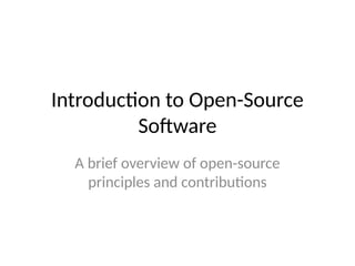 "This presentation provides an introduction to open-source software. It explains the key principles, benefits, and popular projects in the open-source community. It also covers ways to contribute and highlights the impact of open-source software in technology and innovation."