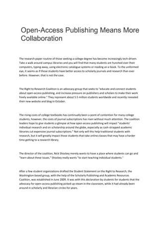 Open-access publishing aims to enhance collaboration and access to scholarly research for students, especially those facing high costs of journal subscriptions. Led by the Right to Research Coalition, which represents around 5.5 million students, efforts are being made to increase awareness and promote free access to academic materials. The coalition seeks to impact both traditional and online learners globally, expanding opportunities for those with restricted access to new research.