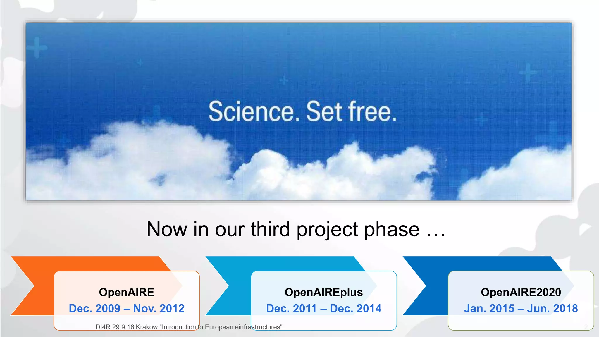 OpenAIRE is a European initiative that fosters open science through a digital infrastructure connecting over 50 partners, including data centers, universities, and libraries. It provides support for open access policies, training, and monitoring research impact, along with tools for data discovery and interlinking services. The platform aims to promote compliance with open access mandates and facilitate collaboration among researchers and institutions across Europe.
