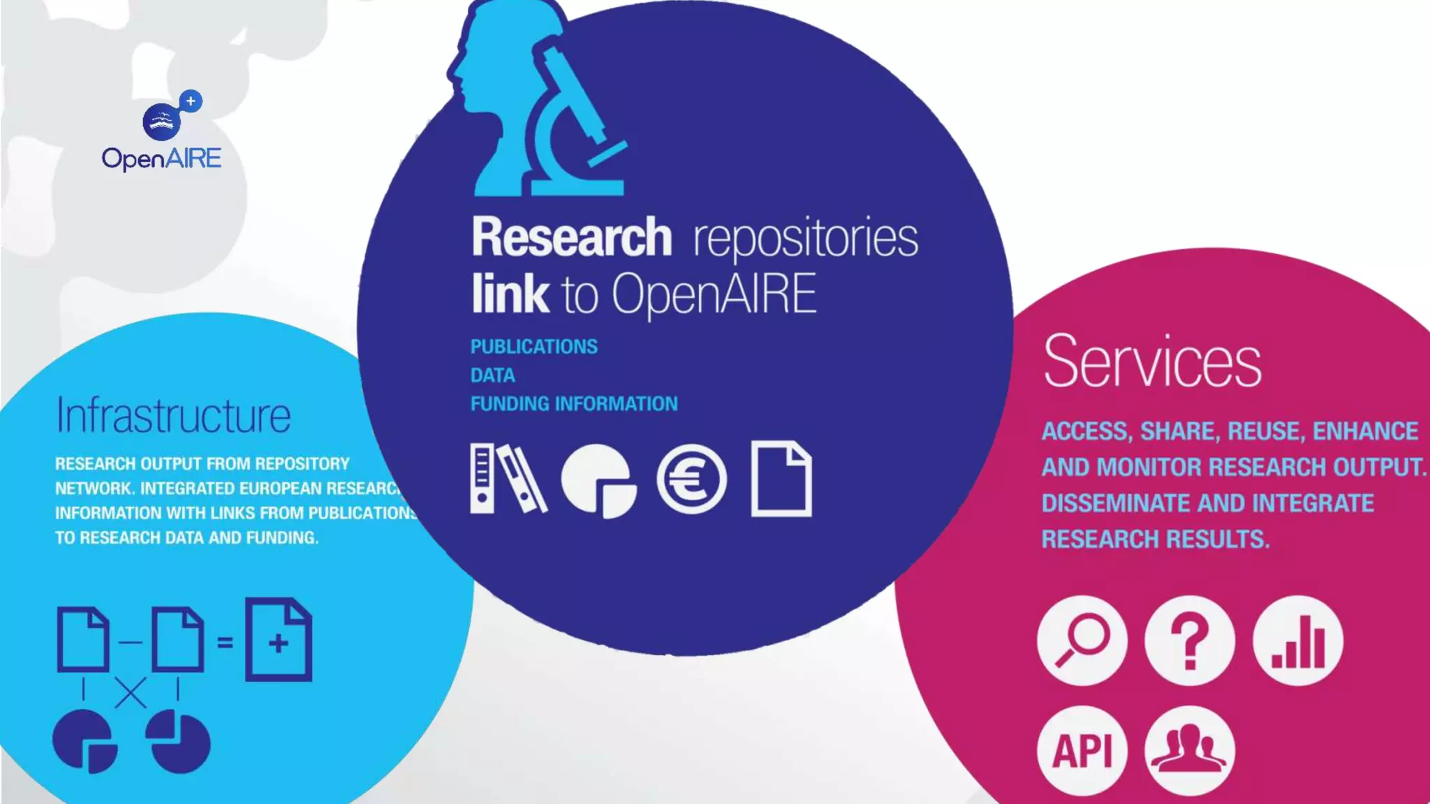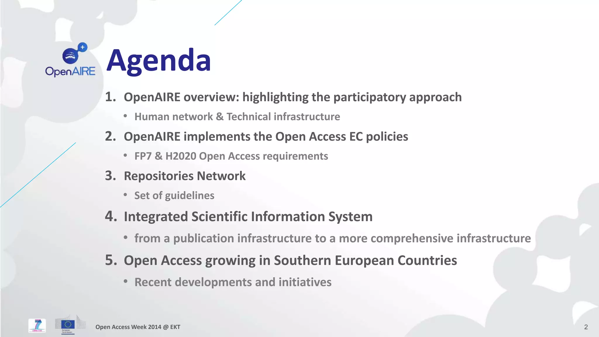 The document discusses OpenAIRE, an open access infrastructure for research in Europe. It provides an overview of OpenAIRE, highlighting its participatory approach involving both a human network and technical infrastructure. OpenAIRE implements the open access policies of the European Commission for FP7 and Horizon 2020 projects. It is moving from a publication infrastructure to a more comprehensive infrastructure that covers all types of scientific outputs, including datasets and projects. Open access is growing in southern European countries, with OpenAIRE supporting the discovery, sharing, and reuse of open access research results across Europe.