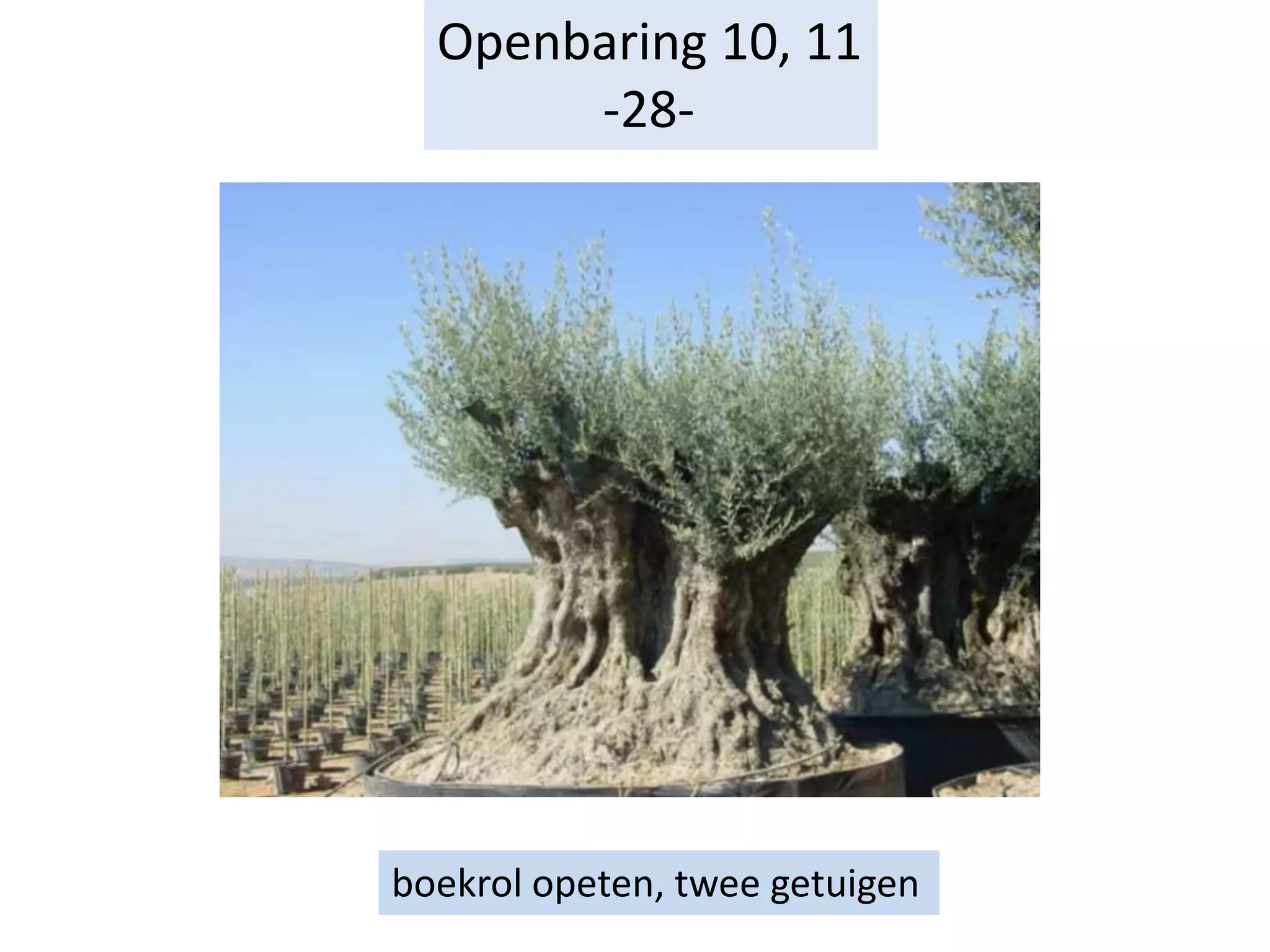Zij zijn de twee olijfbomen en de twee kandelaars, die voor de God van de