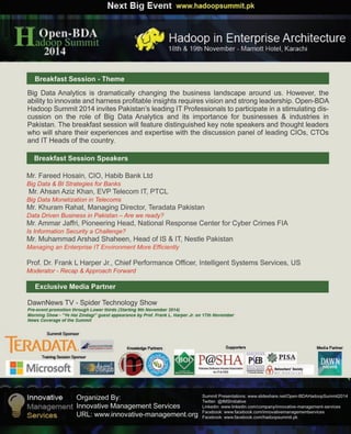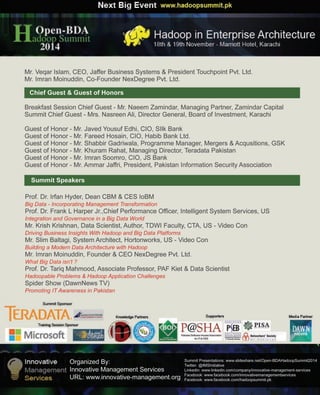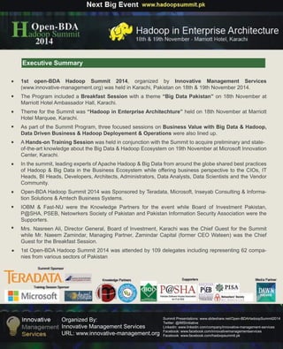 The 1st Open-BDA Hadoop Summit 2014, organized by Innovative Management Services, took place in Karachi, Pakistan on November 18-19, focusing on 'Hadoop in Enterprise Architecture' and featuring sessions on business value and operations related to big data. The summit included a hands-on training session and attracted 109 delegates representing various sectors. Sponsored by companies like Teradata and Microsoft, the event highlighted best practices in big data and Hadoop from global experts.