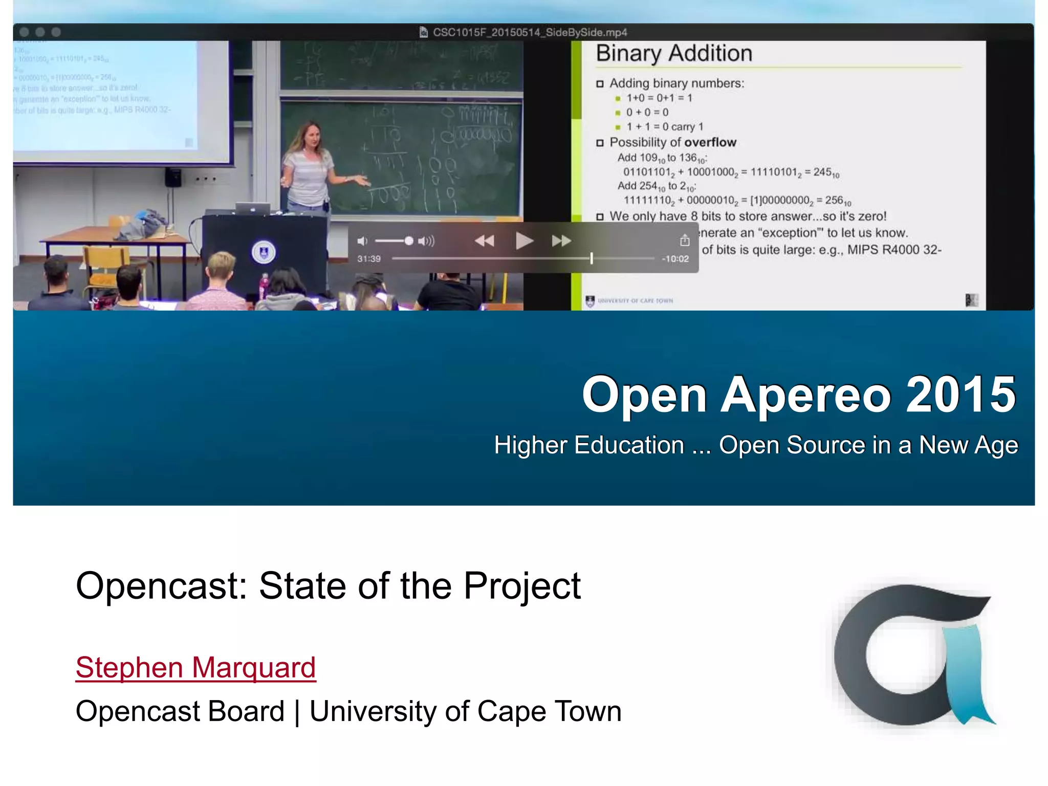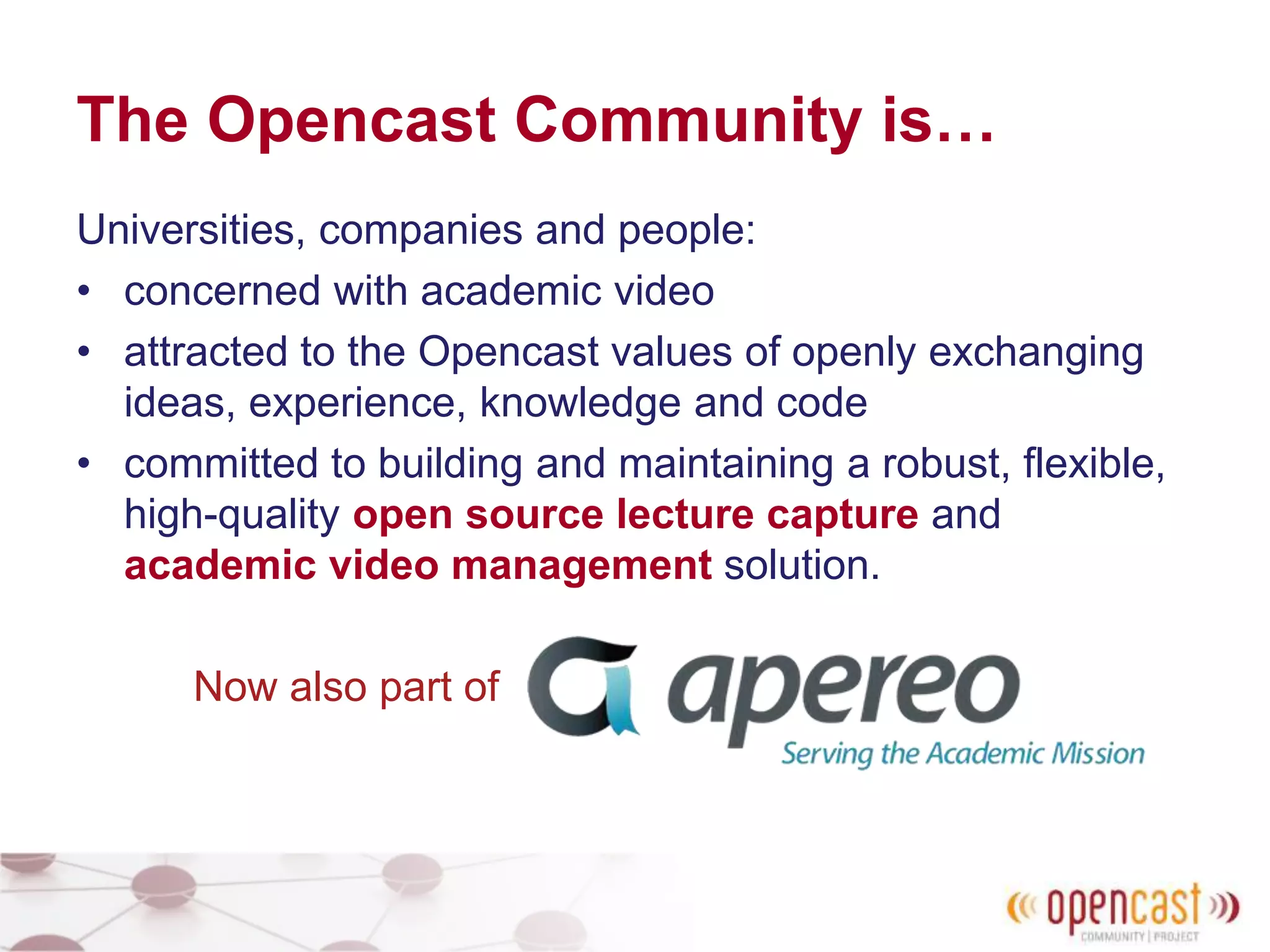 Opencast is an open-source platform for academic video management, widely adopted by institutions for lecture recordings and video production. The project supports a community committed to improving the accessibility and quality of educational media while offering various tools for managing video content. With the upcoming Opencast 2.0 release, enhancements include a redesigned user interface, new HTML5 video player, and improved workflow functionalities aimed at enriching the user experience.