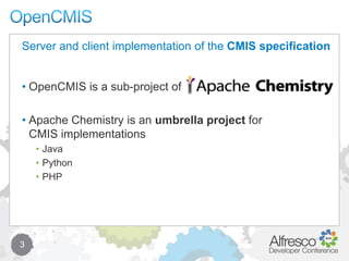 OpenCMIS is an open-source Java library for implementing the CMIS specification, featuring a binding-agnostic API that simplifies ECM interactions. The project has reached a stable state with its 0.1.0 release, allowing developers to create sessions, manage objects, and utilize caching effectively. The document includes various examples for connecting to repositories, querying, and manipulating documents and folders within the CMIS framework.