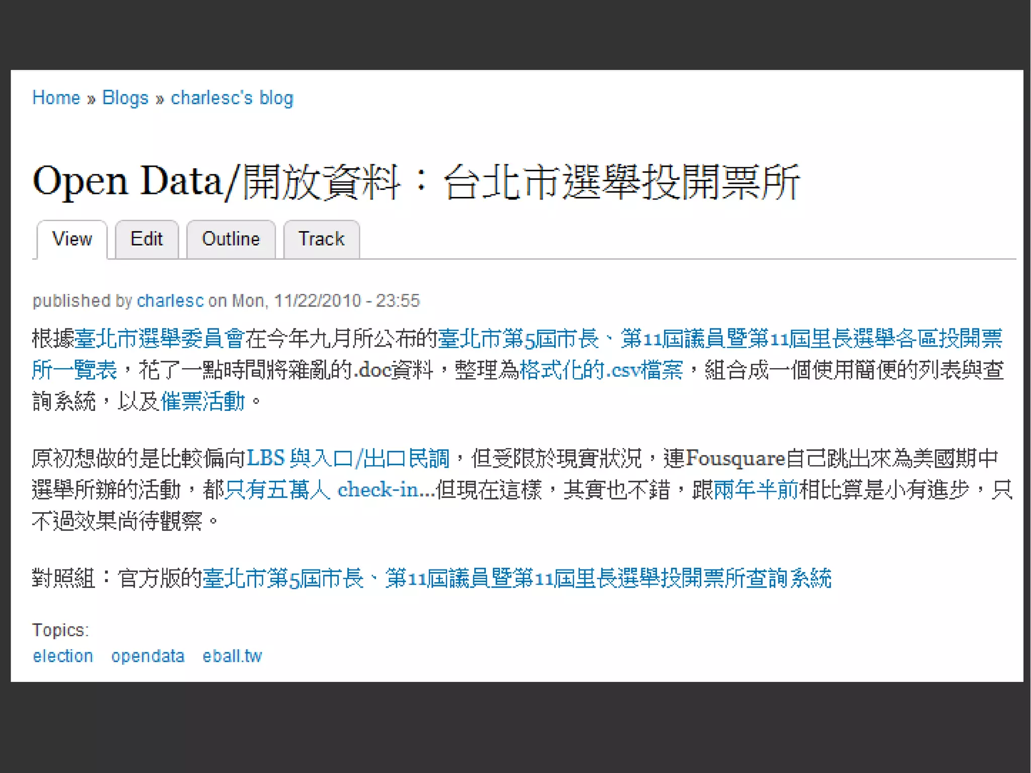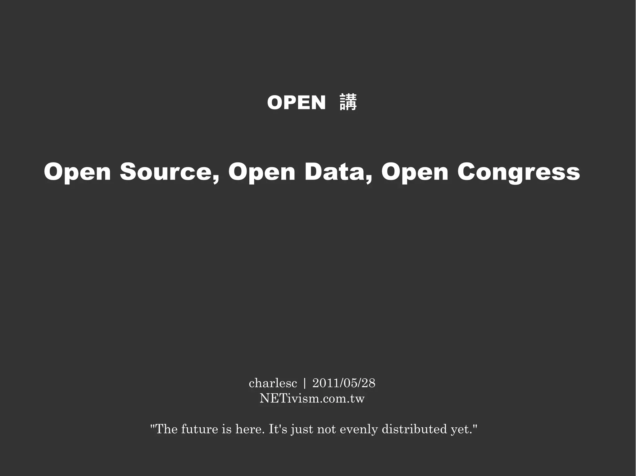This document discusses open source, open data, and open congress. It provides links to resources about the open source way of believing in open exchange, participation, rapid prototyping, meritocracy and community. It outlines three principles of open government data around being spidered, machine readable and reusable. Open data is said to enable accountability, citizen utility and economic opportunity. The document also mentions open congress and open data for non-profits and NGOs.