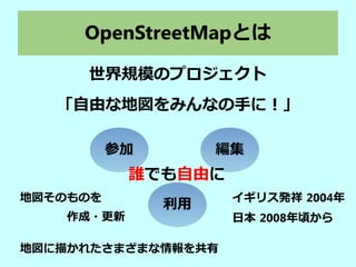 OpenStreetMapとは 参加 編集 利用 誰でも自由に イギリス発祥 2004年 日本