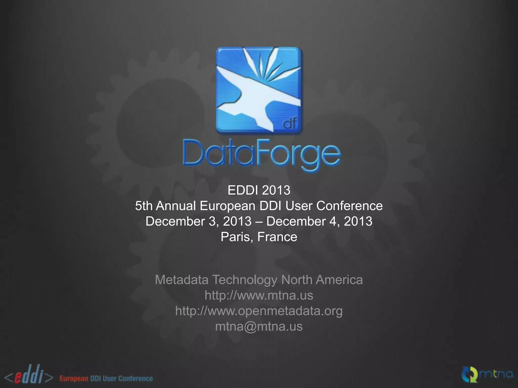 The 5th Annual European DDI User Conference in December 2013 showcased tools and services for statistical and scientific data management, aiming to promote standards and alleviate the complexities of metadata management. Key offerings include a suite of applications for data transformation, reporting, and integration, aiming to facilitate open data usage and provide various configurations for user needs. Features discussed include support for diverse data formats, metadata generation, and a community-driven approach to enhancements and services in data management.