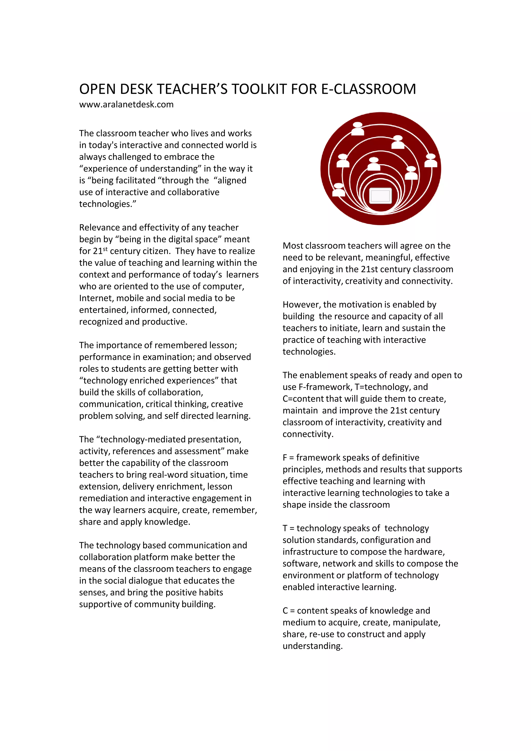 The document introduces the Open Desk Teacher's Toolkit for E-Classroom, which provides teachers with free and open framework, technology, and content to build their capabilities for using interactive learning technologies in teaching. The toolkit includes digital tools like a digital whiteboard, presentation maker, and activity creator to help teachers design technology-enabled lessons. It aims to support teachers in realizing improved teaching and learning through the use of open standards and globally benchmarked digital content.