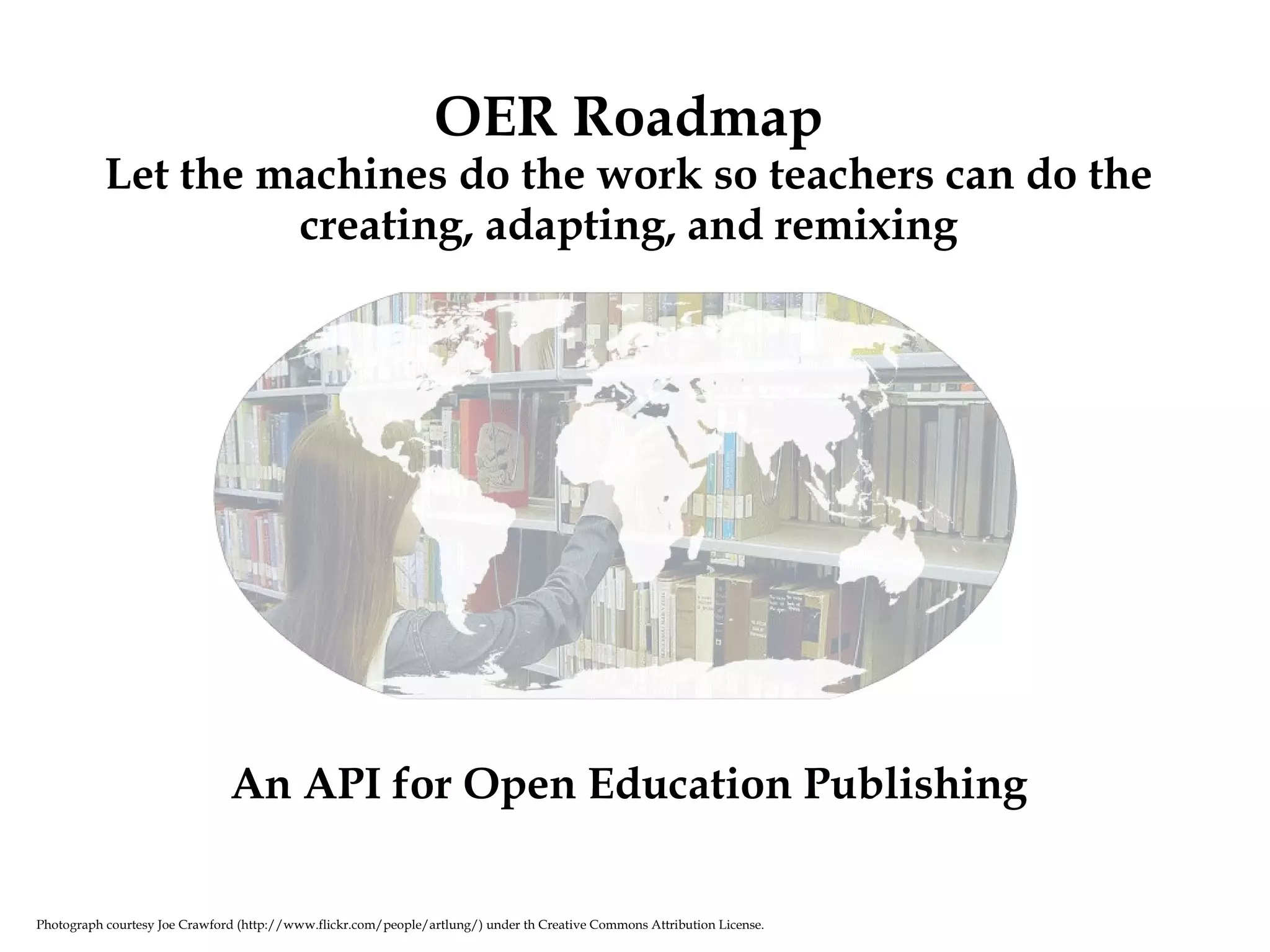 The document outlines an OER roadmap aimed at developing an ecosystem for open education resources that enables teachers to focus on content creation while machines handle operations. It emphasizes the importance of remixable repositories with modular, pluggable, and shareable components, as well as feedback mechanisms for enhancing learning processes. The roadmap also includes steps for implementation, community engagement, and tools for easy publishing and sharing of educational content.