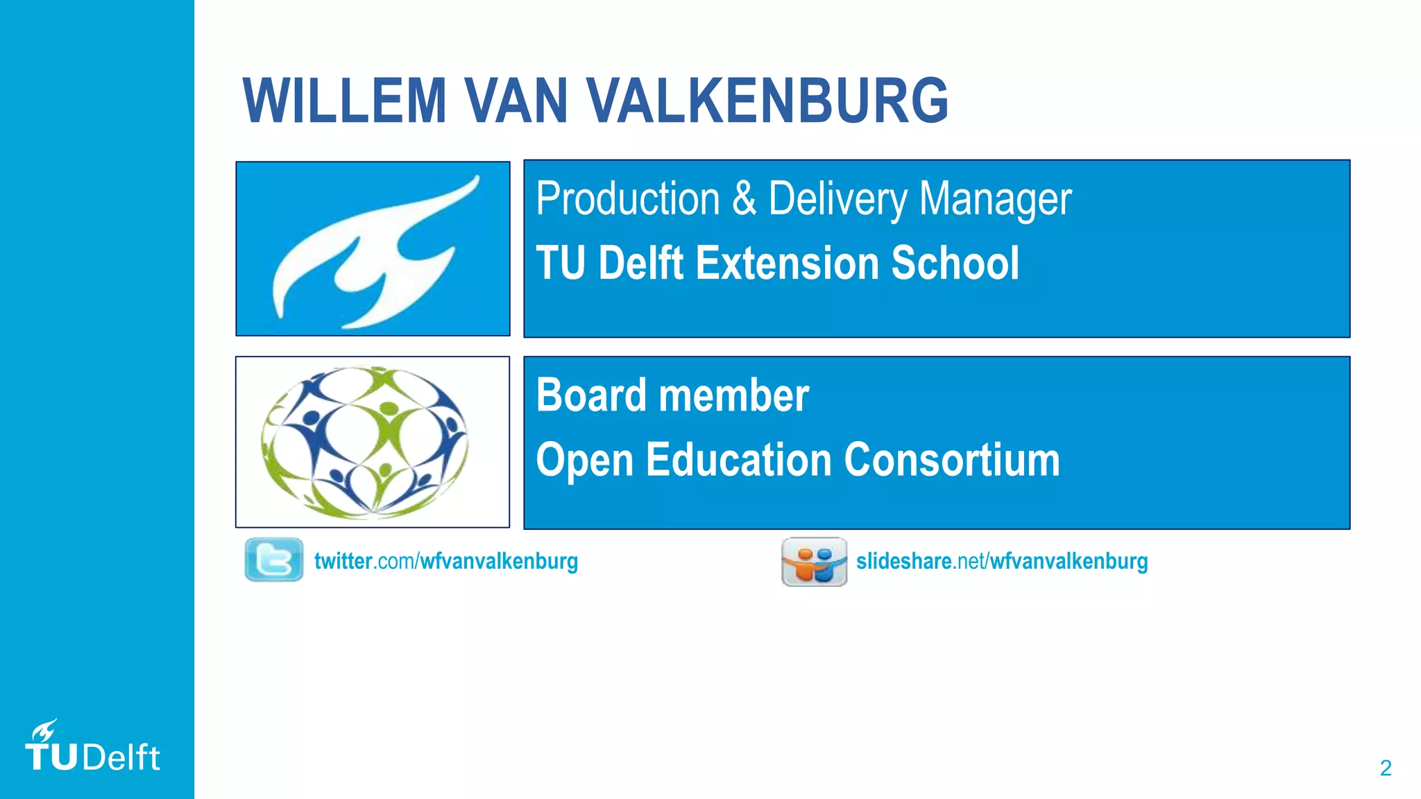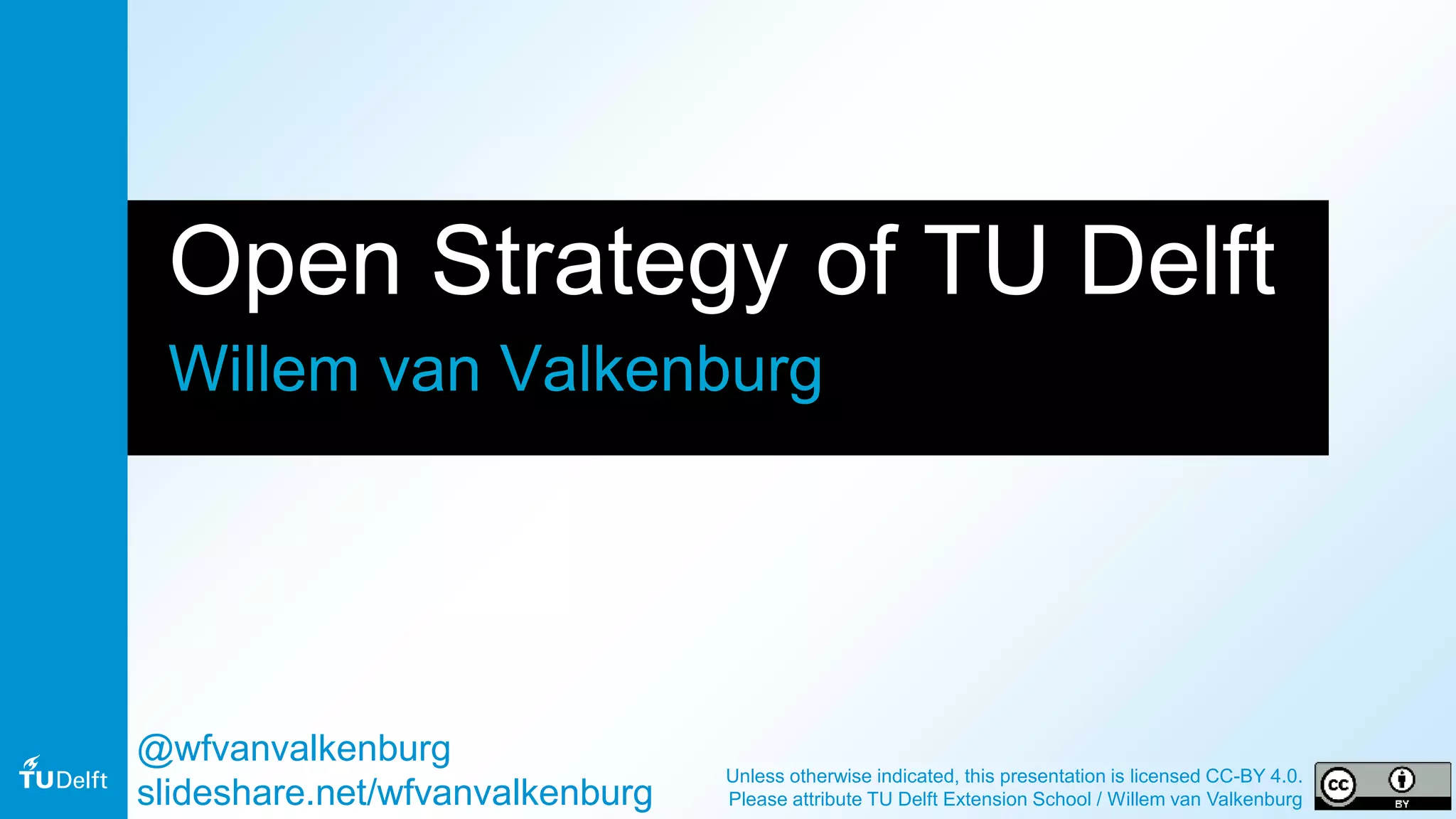 The document summarizes TU Delft's open strategy, which aims to educate the world through open and online education. It outlines TU Delft's program to deliver high-quality open courses, MOOCs, online courses and professional education on various topics. It discusses TU Delft's open activities in research, education and ICT through initiatives like OpenCourseWare, MOOCs on edX, open data research and open source software. The presentation also covers TU Delft's use of open licensing for educational materials under Creative Commons, and its invitation to external researchers for open research projects.