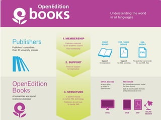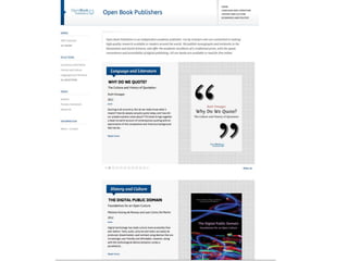 This document describes an open access books platform for publishing humanities and social science works. The platform aims to build an international catalogue accessible worldwide with editorial spaces for publishers and reading features like an online reader. It will have dissemination features and a publishing workflow. The platform is open to different economic models including freemium open access with free HTML content and premium services, as well as libre open access like gold, unglued, unlatched, and "left wing" open access. It aims to provide an inclusive and dynamic open access approach for all types of publishers.