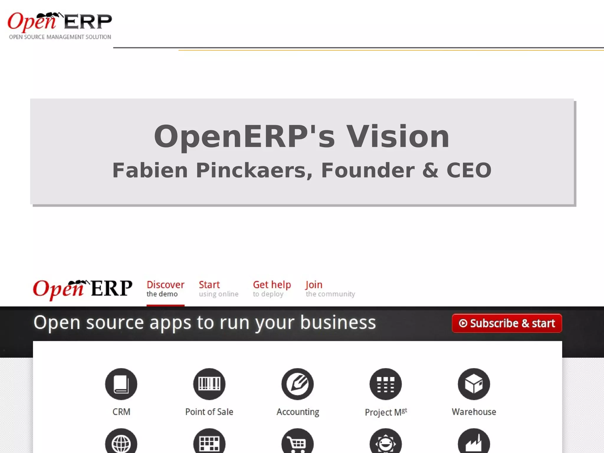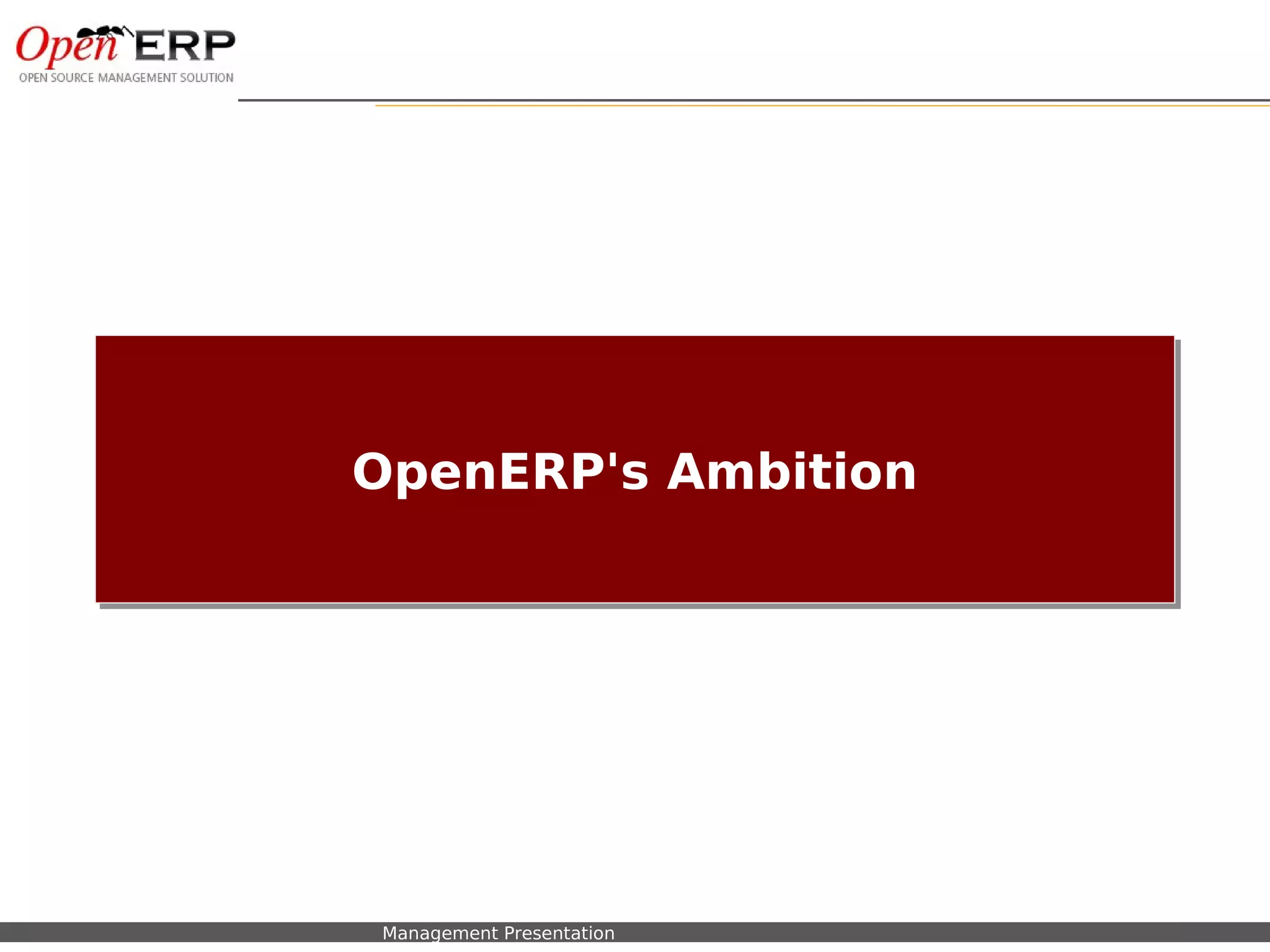 Fabien Pinckaers, the founder and CEO of OpenERP, outlines the company's vision and ambitions. The business vision is to become the number 1 open source player worldwide through a disruptive approach. The company vision is to maintain a challenging but fun work environment. The strategy vision is that being fully open source and open minded allows them to build better products. The presentation also provides details on OpenERP's growth, customer satisfaction, and priorities to reach more users through easier usability and configuration.