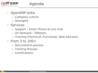 The document summarizes a presentation given by OpenERP India about the company. It discusses OpenERP India's culture of continuous learning and evolution. It describes the company's services including support, offshore development, and training. It also provides details about OpenERP India's recruitment and training processes for growing from 3 employees to over 100.
