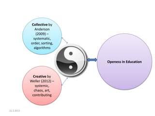 The document discusses openness in education through three dimensions: the collective, creative, and technology. The collective dimension refers to organizing knowledge systematically through algorithms and left brain functions. The creative dimension focuses on chaos, art, and contributing through right brain activities. Technology developments physically manifest knowledge storage and creation by supporting the connection between the collective consciousness and individual openness in education.