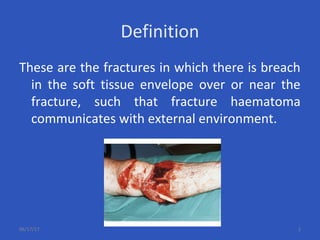 The document provides information on the management of open fractures. It defines open fractures as fractures where there is a breach in the soft tissue envelope exposing the fracture site. Key aspects of management include thorough initial assessment, adequate irrigation and debridement within 6 hours, appropriate antibiotic therapy, and stabilization of the fracture either through external or internal fixation. Complications of open fractures discussed include infection, hypovolemic shock, compartment syndrome, fat embolism, acute respiratory distress syndrome, and neurovascular injuries.