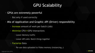 The document presents advancements in GPU command processing aimed at improving performance in graphics rendering, specifically through NVIDIA's nv_command_list technology. It discusses issues with traditional OpenGL commands, including high CPU workload and drawcall overhead, and proposes solutions such as tokenized rendering and bindless technology to reduce driver overhead and streamline the rendering pipeline. Performance demonstrations highlight significant improvements in drawcall throughput and GPU utilization using these new methods.