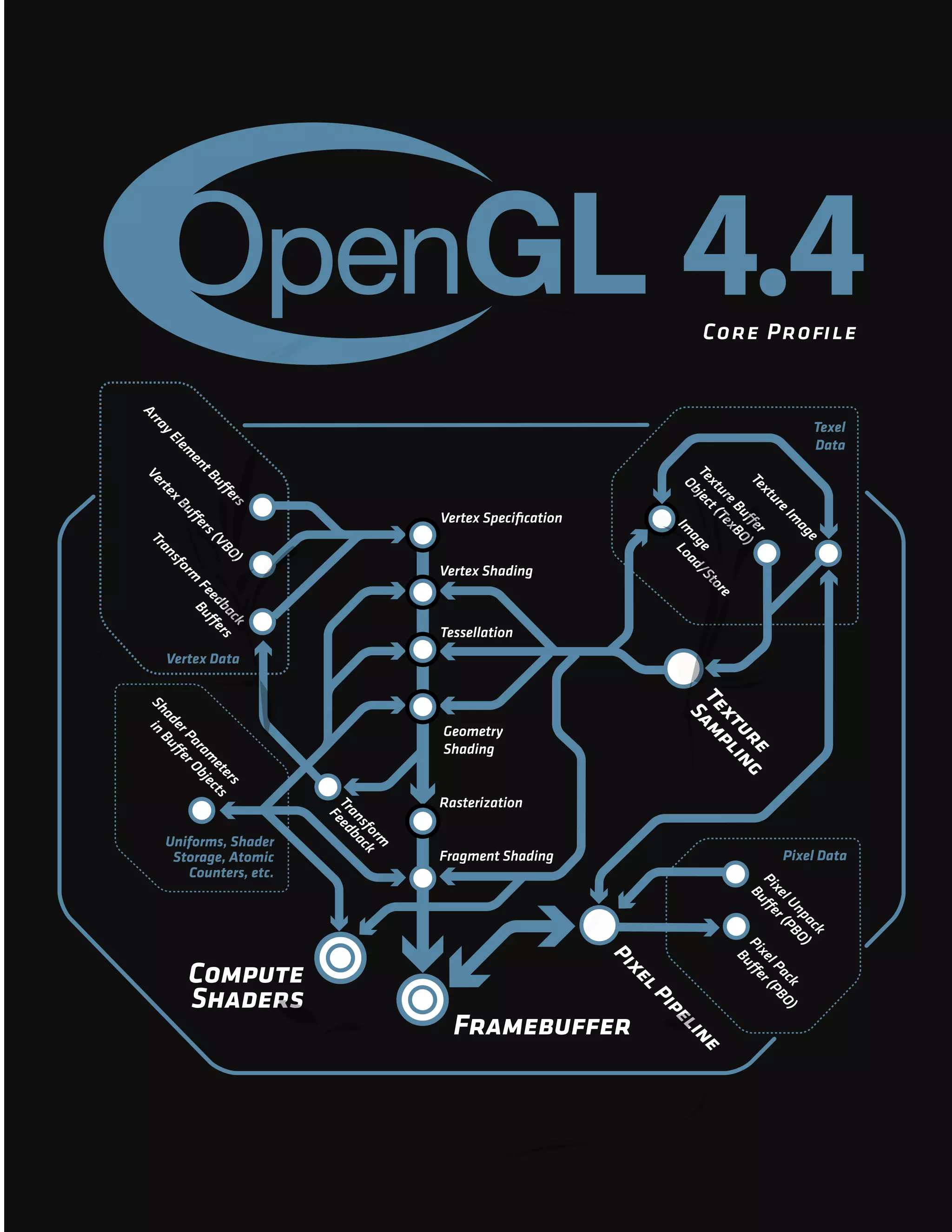 This document provides an overview and specification of the OpenGL graphics system. It describes the programmer's view of OpenGL, the types of objects that comprise the OpenGL state such as buffer objects, shader objects and program objects. It also outlines the execution model including command syntax, numeric representation, and the dataflow and event-based rendering paradigms. The specification is the reference document for OpenGL version 4.4 and is maintained by the Khronos Group.