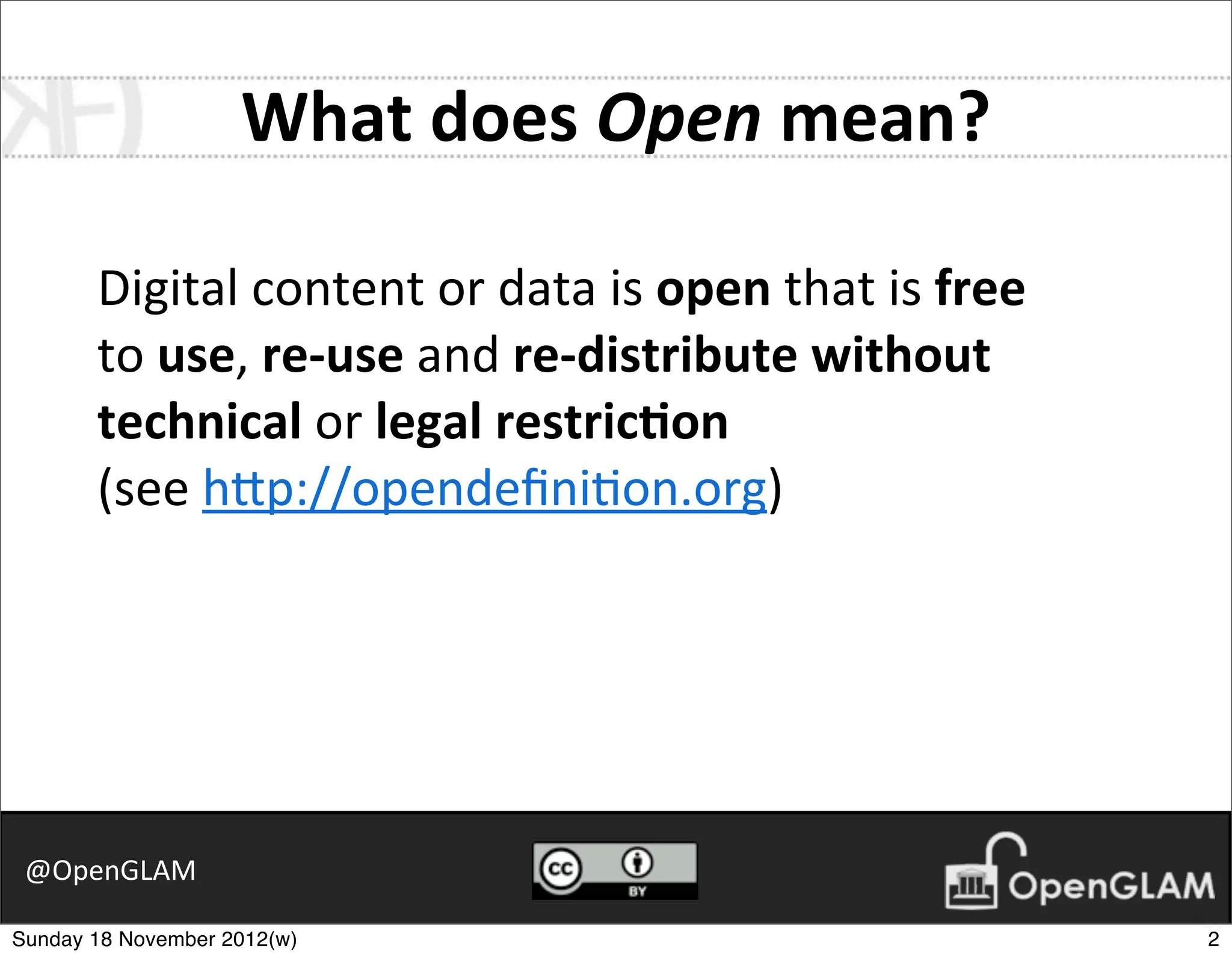 The document discusses open data and open content from cultural heritage institutions like galleries, libraries, archives, and museums (GLAMs). It defines open as digital content that is free to use, modify, and share. It encourages GLAMs to open up their metadata, digitized collections, and user generated content to help fulfill their public missions of sharing cultural heritage with the world. Open data allows for larger global audiences to access and participate with cultural collections.