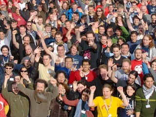 Open source software is built by fragmented communities and businesses struggle to find support. The document proposes creating an open source hub and a LinkedIn for programmers to address these problems. It details growing the audience by connecting communities and projects through features like contests and job postings to generate revenue and provide recruiting and consulting services.