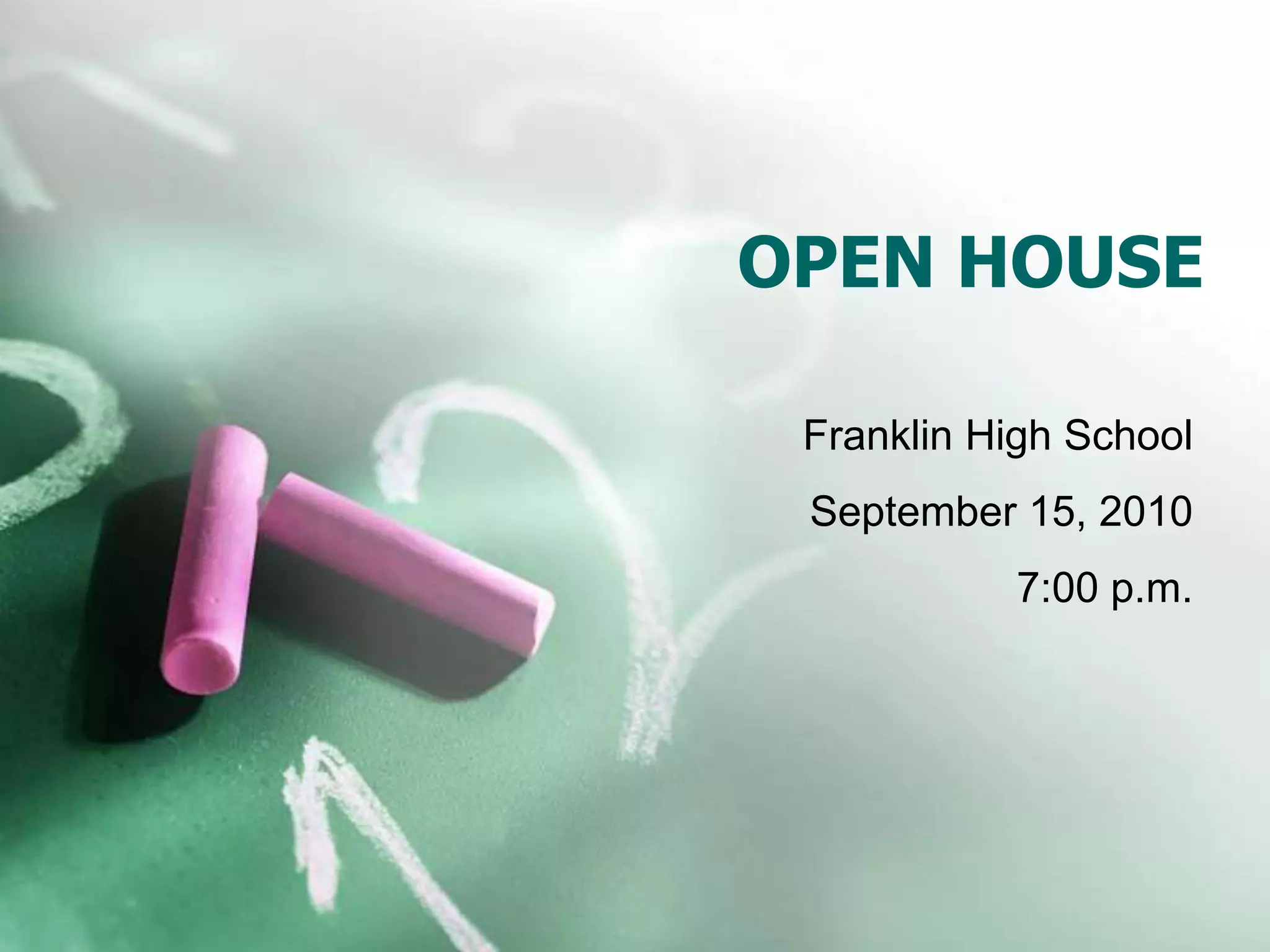The open house document provides information for parents about Franklin High School's business department courses, grading policies, and opportunities for involvement. It summarizes that the open house will introduce the Web Technologies, Money Matters, and Securities and Investments courses. Grades are based on labs, classwork, exams, and a final exam, using a standard A-F scale. The document encourages parents to get involved through the parent portal and check the business department website for more resources.