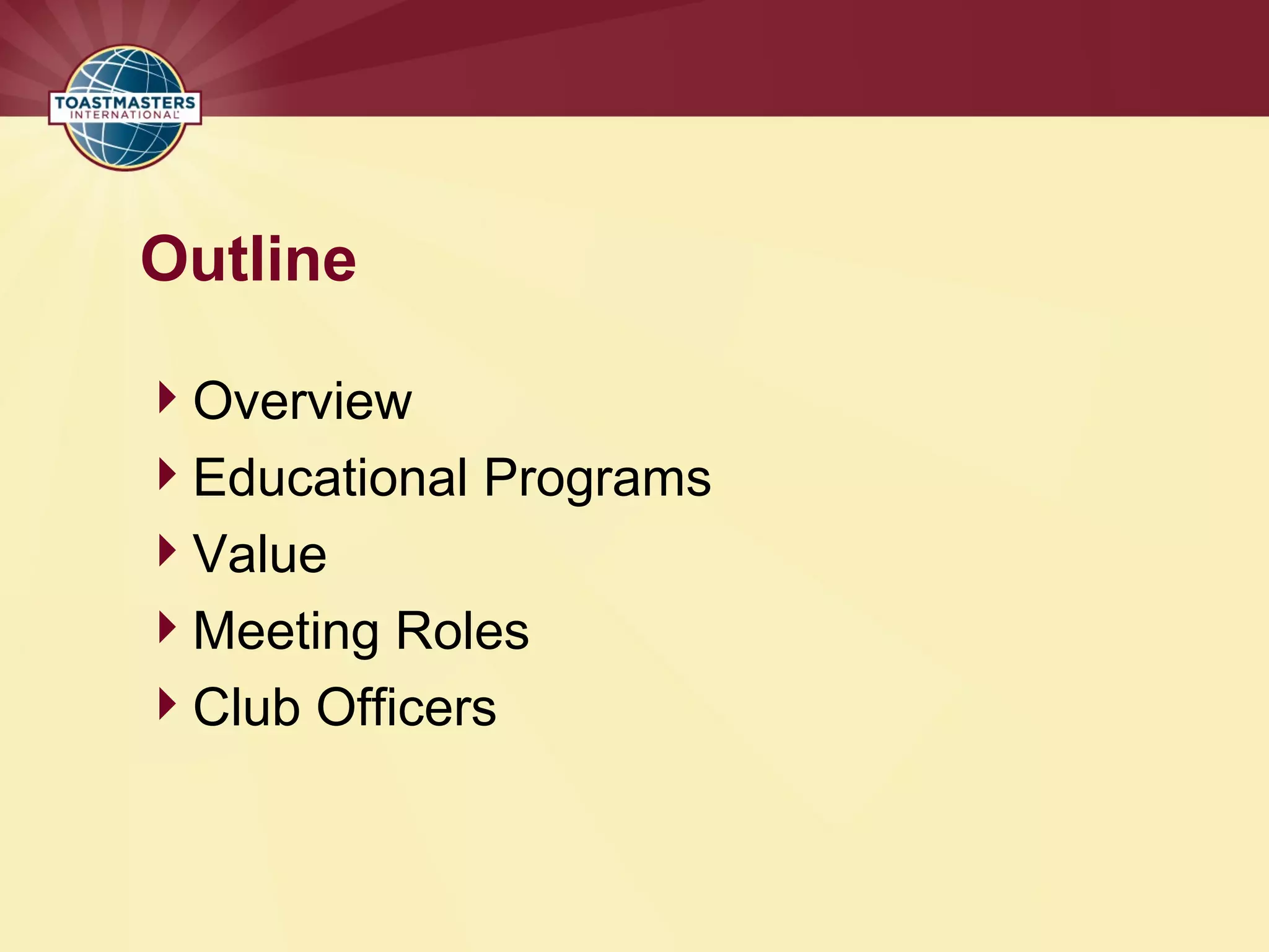 Toastmasters is a nonprofit educational organization that teaches public speaking and leadership skills through practice and mentorship. Members learn by attending weekly meetings to take on roles like giving speeches, evaluating others, or leading discussions. The organization provides step-by-step communication and leadership programs comprising manuals and projects. Members work through these at their own pace while gaining confidence, skills, and professional connections. Toastmasters clubs are led by officer roles and follow a regular agenda at low-cost meetings designed to be supportive learning environments.