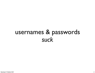 This document discusses OpenID, an open standard for decentralized authentication on the web. It notes some problems with traditional username and password systems like passwords being hard to manage and user databases being vulnerable to theft. OpenID provides a solution by allowing users to authenticate using a URL of their choice, like a personal domain name, rather than having separate usernames and passwords for each site. When authenticating with a new site, OpenID verifies the user's identity through their OpenID provider rather than the site directly. The document provides examples of how OpenID works and can be implemented using libraries like Net::OpenID::Consumer in Perl. It also addresses questions like how to choose an OpenID provider and maintain multiple personas.