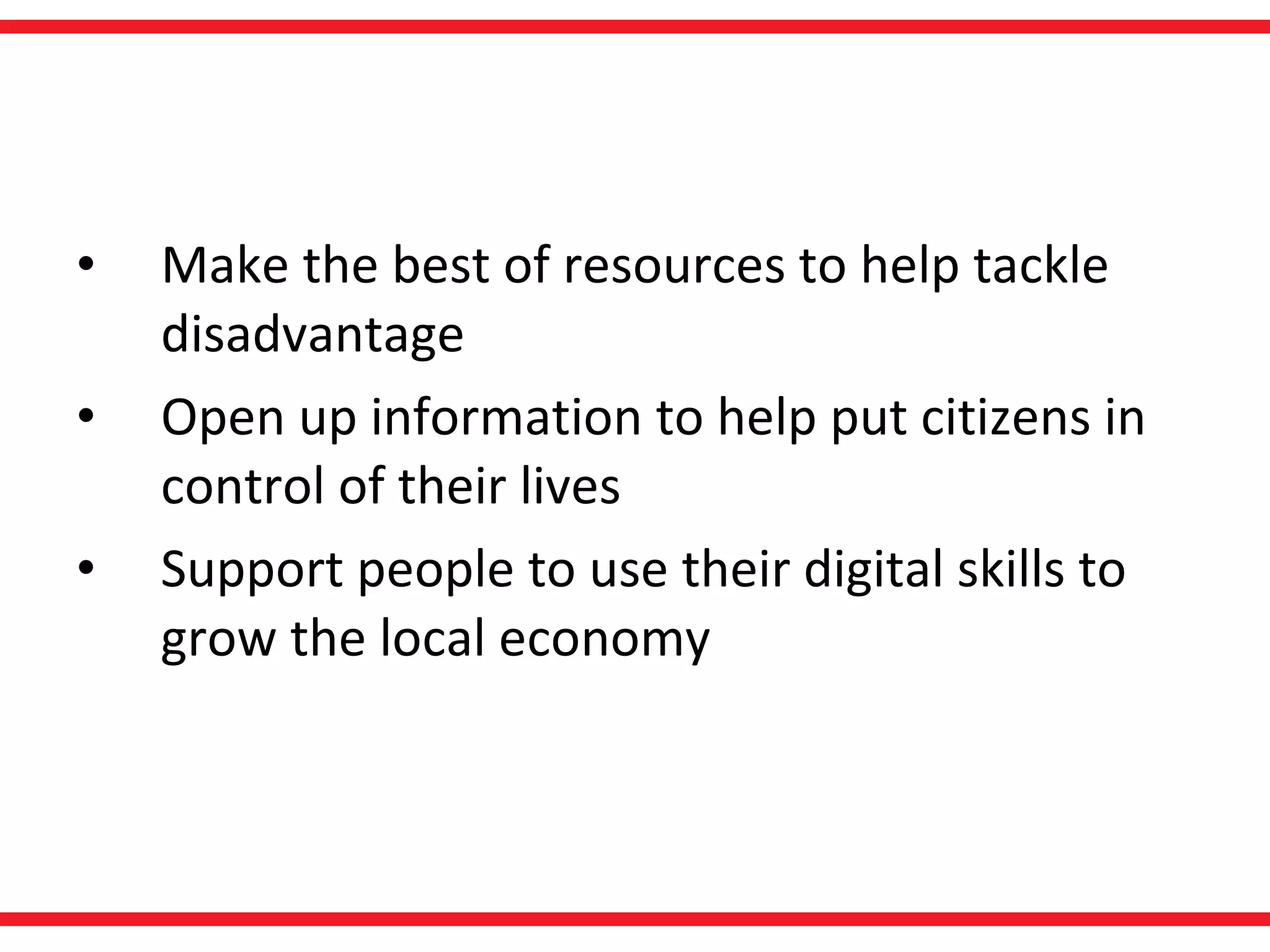 The document discusses opening up government information to support transformation and help citizens. It proposes making best use of resources to tackle disadvantages, opening up information to put citizens in control of their lives, and supporting people to use digital skills to grow the local economy. The document also discusses enabling people to access, visualize and share information; publishing open data in an open format; and providing an environment for businesses and non-profits to build applications. Finally, it discusses getting people with different skills together to develop innovations to help communities.