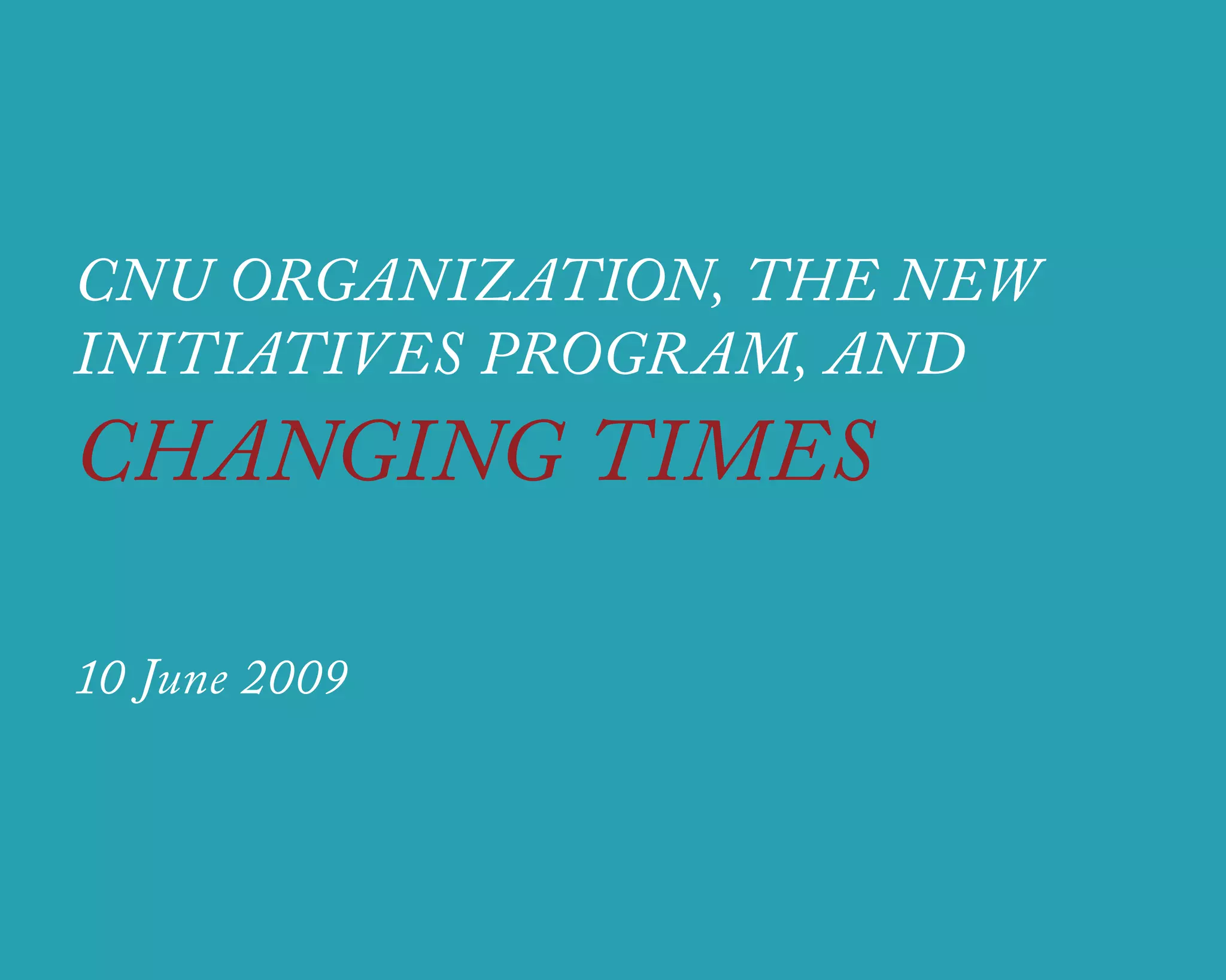 The document discusses the Congress for the New Urbanism (CNU) organization. It began with 6 people and has grown to over 3,000 members. CNU holds annual conferences around the country. It operates as a 501(c)3 nonprofit with a board of directors and small staff. CNU serves as a central resource on New Urbanism and coordinates initiatives and member-led projects to propose changes to professional practices through publications and standards. Current initiatives include projects on transportation, sustainability, and affordable housing. The document encourages members to get involved by connecting with others and developing initiative proposals to advance CNU's work.