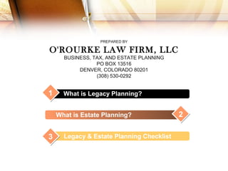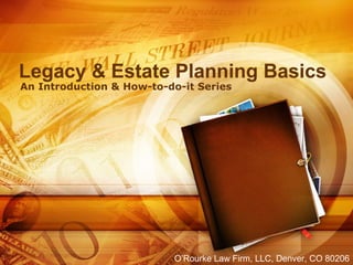 This document provides an introduction to legacy and estate planning. It defines legacy planning as planning for the transfer of assets and values between generations. Estate planning is defined as planning for the management and transfer of one's estate during their lifetime and after death. The document includes a checklist of common elements of legacy and estate planning, such as writing a will, assigning heirs and beneficiaries, establishing trusts, and considering long-term care needs and charitable giving. It aims to educate people on the basics of estate planning and its importance.