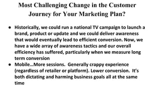The documents discuss several challenges in modern marketing, including the fragmentation of media consumption making it difficult to allocate budgets effectively, and the large number of disparate channels making it hard to drive efficient awareness. Mobile experiences are generally poor with lower conversion rates. Additionally, discovering the proper audiences to target and attributing engagement across touchpoints is challenging. Some successful channels mentioned include paid search, influencer marketing, affiliates, and social advocacy programs. Amazon is described as both a threat due to its size and a helpful marketing partner for its targeting and retail search options. Native advertising and voice platforms are identified as overhyped due to difficulties in measurement and driving adoption.